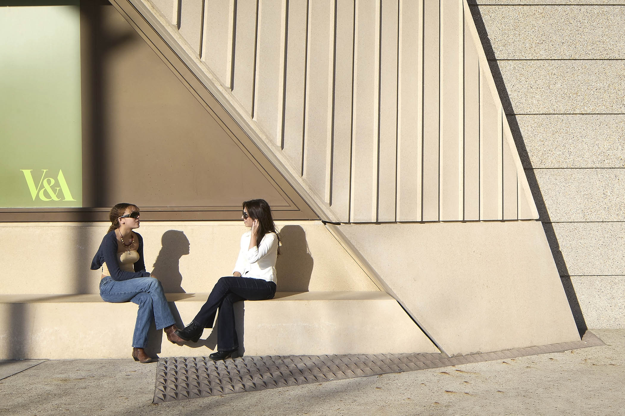 The “sleeve” is a work of craft and difficulty. It is made of sand-coloured precast concrete panels, fabricated by Techrete of County Dublin, that bend around the building’s complex shape. Their surface is marked with a network of fine lines and with thin ridges and furrows, creating a three-dimensional puzzle in which everything had to align precisely when the heavy panels were lifted into place. There are many Vs and As in the design, their angles echoing those of the letters of the museum’s logo, from big triangular openings to the lines on the panels to the profiles of the ridges and panels. The exterior gets more solid as it rises, contrary to gravity, but in line with the fact that it needs to be more open at its entry levels and more opaque around its galleries.
