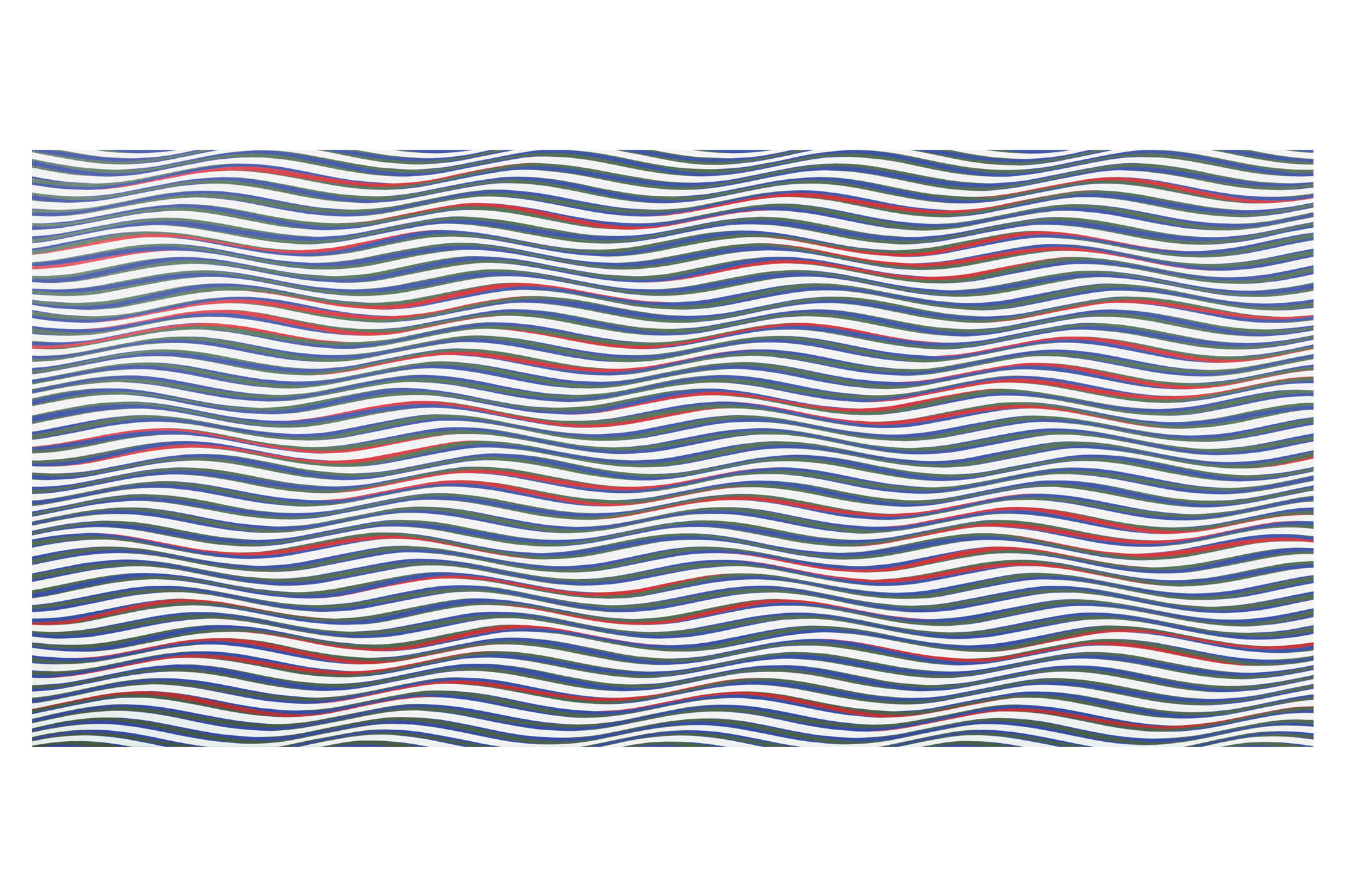 But once inside the (windowless) gallery, the paintings wrest back control. Curated in close collaboration with Riley, still actively working at the age of 94, the display is not chronological, yet it covers every decade of her career. Works resonate across the walls and over the years – such as the mesmeric Streak 3, dating from 1980, placed opposite Arrest 3, from 1965. In both, curved lines ebb and flow horizontally over the width of the canvas, summoning hills and valleys that rise and fall with extraordinary vividness from the flat surface.
