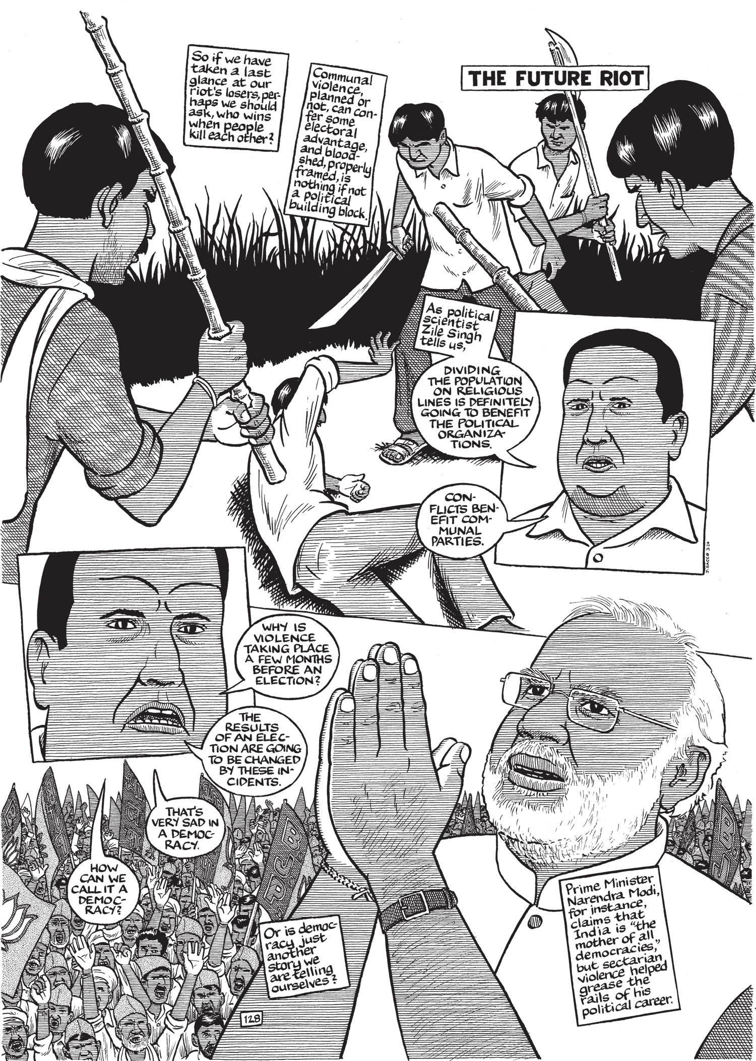 Joe Sacco is an award-winning journalist who uses comics as the medium for his reportage. He was born in Malta in 1960 and raised in Australia and then the US, studying journalism at the University of Oregon. His breakthrough work, Palestine, based on his reporting from Gaza and the West Bank, won him an American Book award in 1996. His other notable publications include Safe Area Goražde (covering the war in Bosnia) and Footnotes in Gaza. Sacco’s latest book, The Once and Future Riot, explores the aftermath of violent confrontations between Jat Hindus and Muslims in Uttar Pradesh in 2013. He lives in Portland, Oregon.