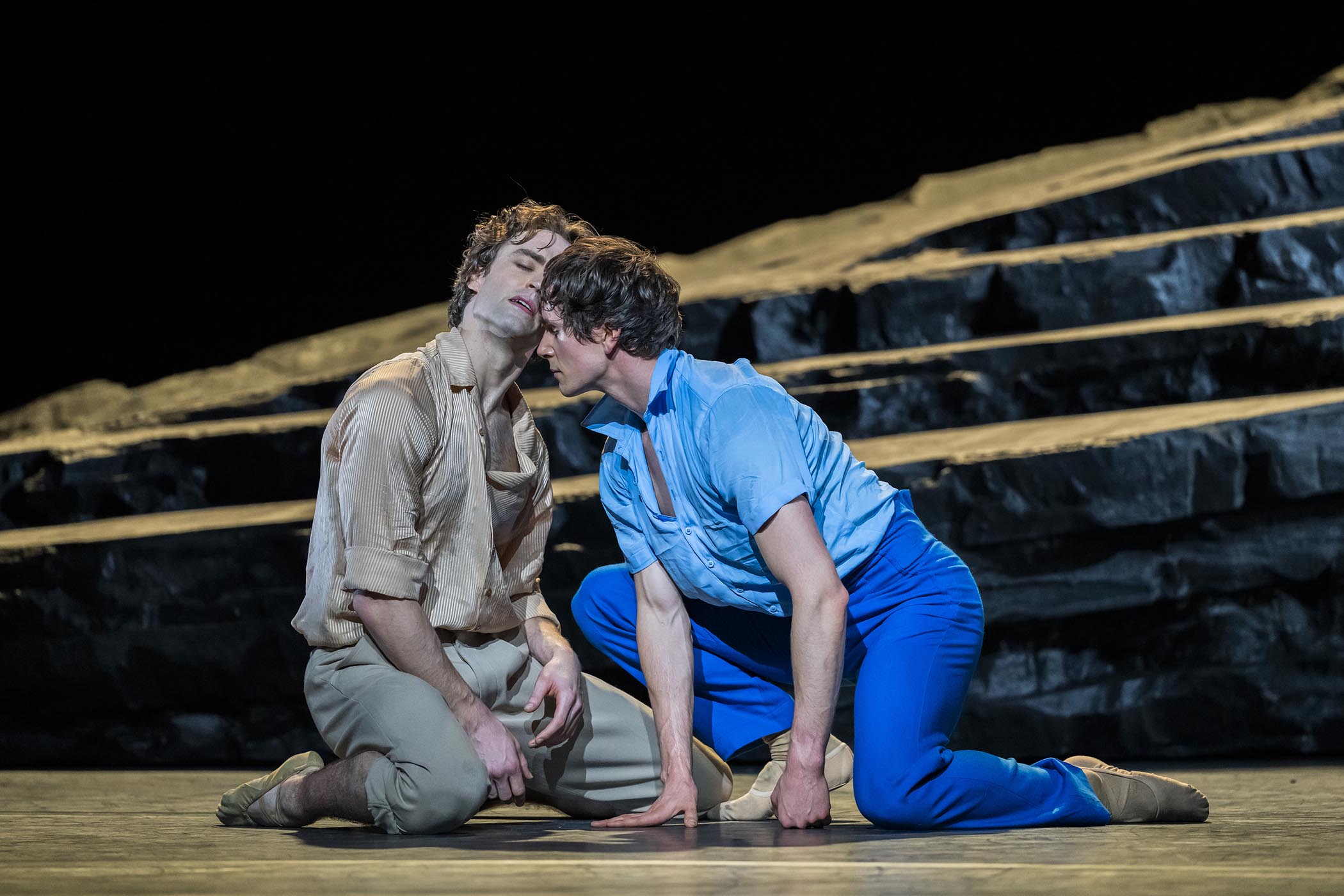 Chloe Lamford’s design, which consists of a slate bridge, strongly rooted but stretching out to another world, and Annemarie Woods’s rich costumes, sombre browns and greys enlivened by Bracewell’s bright blue shirt enhance the mood. Fabiana Piccioli’s dramatic lighting creates chiaroscuro shadows, like a storm on a Suffolk beach, picking out the stretched shapes of the dancers, highlighting the emotions suggested by both music and choreography.