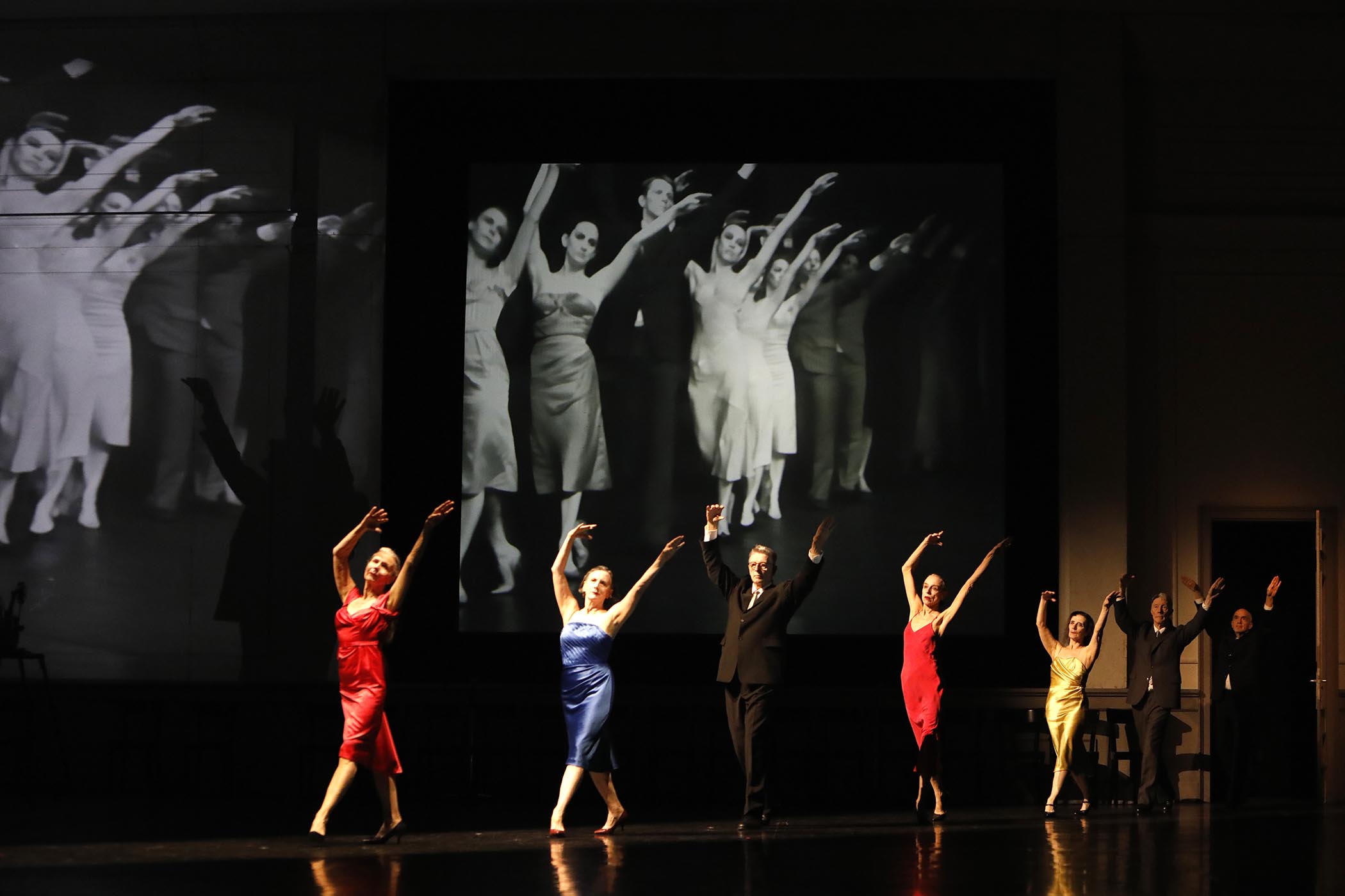 A 76-year-old woman in a red silk frock stands at the front of the stage, smoothing the fabric over her hips, checking her teeth in an imaginary mirror. She looks up. Above her, projected on to gauze, towers an image of her younger self, performing the same gestures. It is as if she is haunted by her past, but also having a conversation with it.