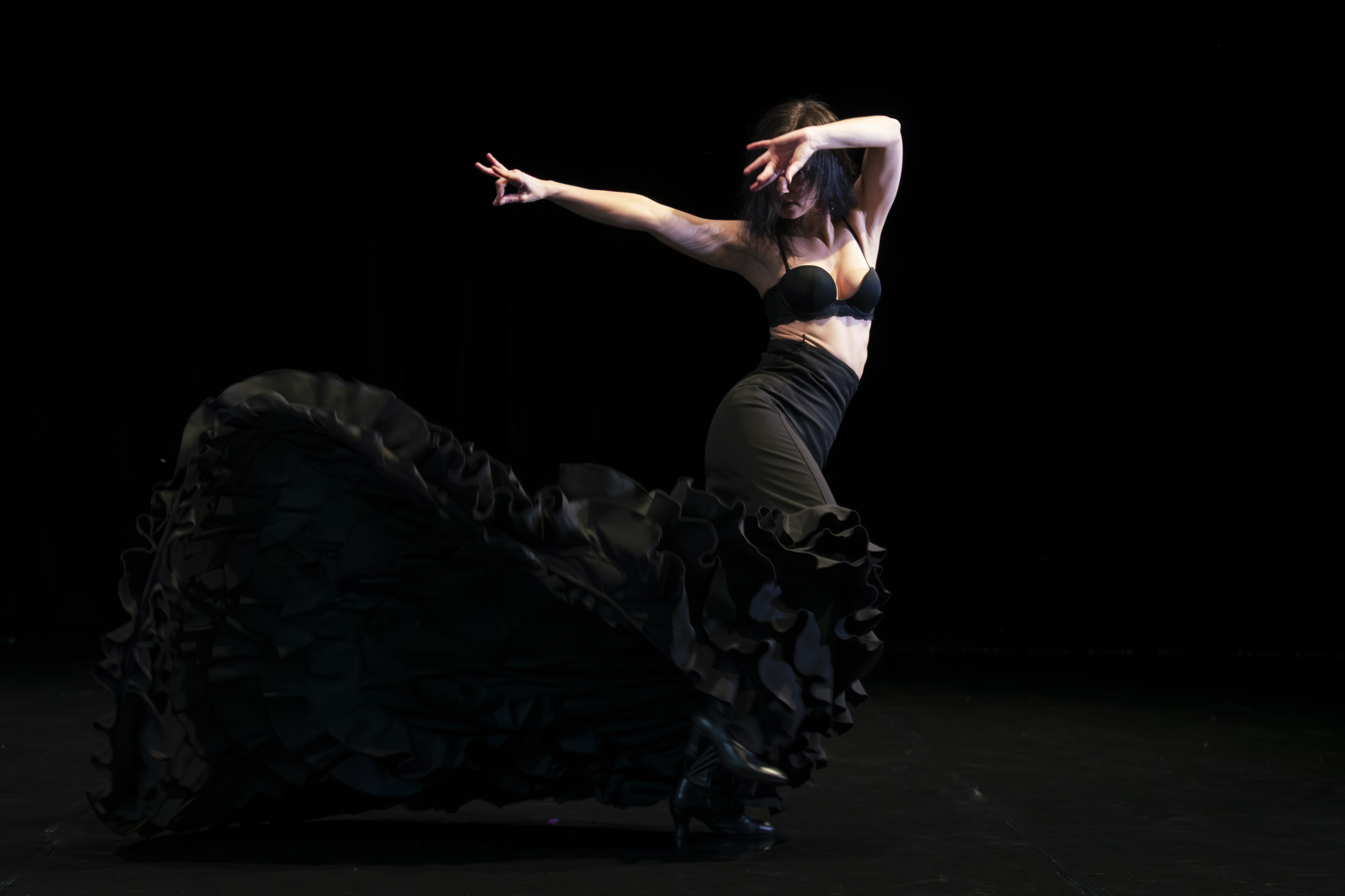 Isadora D’Héloïsa’s Entrecuerpos (pictured), another solo show, is an intriguing mixture of flamenco and voguing, featuring three outstanding musicians (Bryan Reyes on guitar, Ago Hernandez on percussion and singer Carlos de Luisa), inventive arm-ography and a brilliant use of a flounced skirt. Unfortunately, in an in-the-round setting, it was designed to face entirely frontwards so I saw mainly backs.