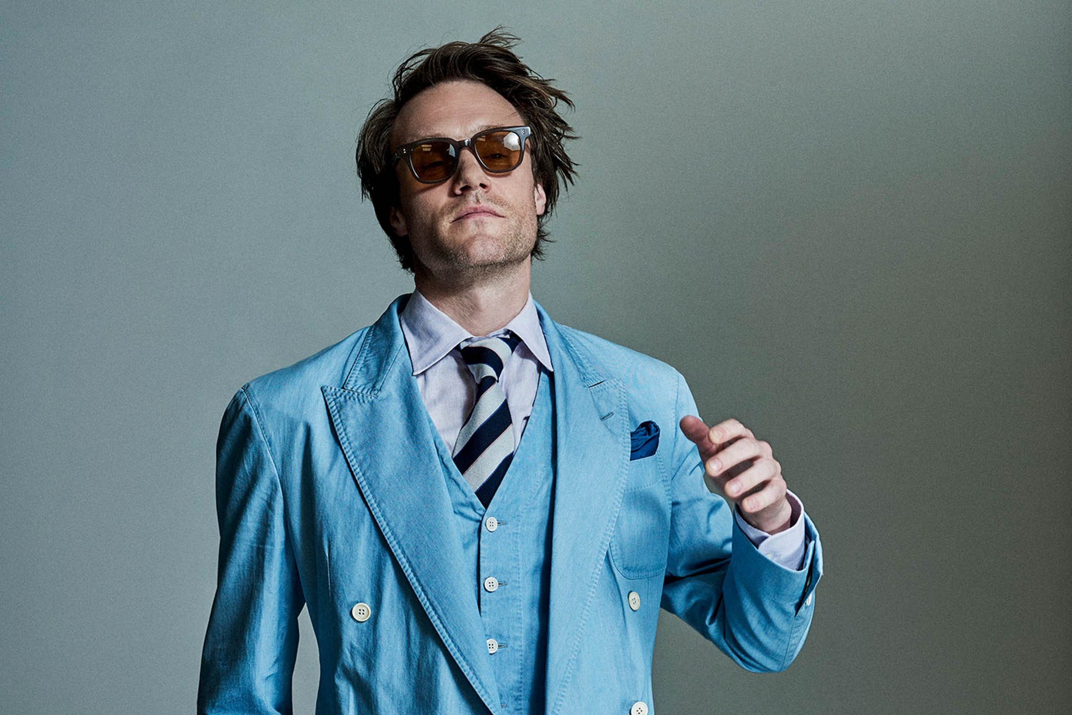 Styling by Catherine Hayward; blue suit, shirt, tie and sunglasses all by Dunhill. Grooming by Charley McEwen