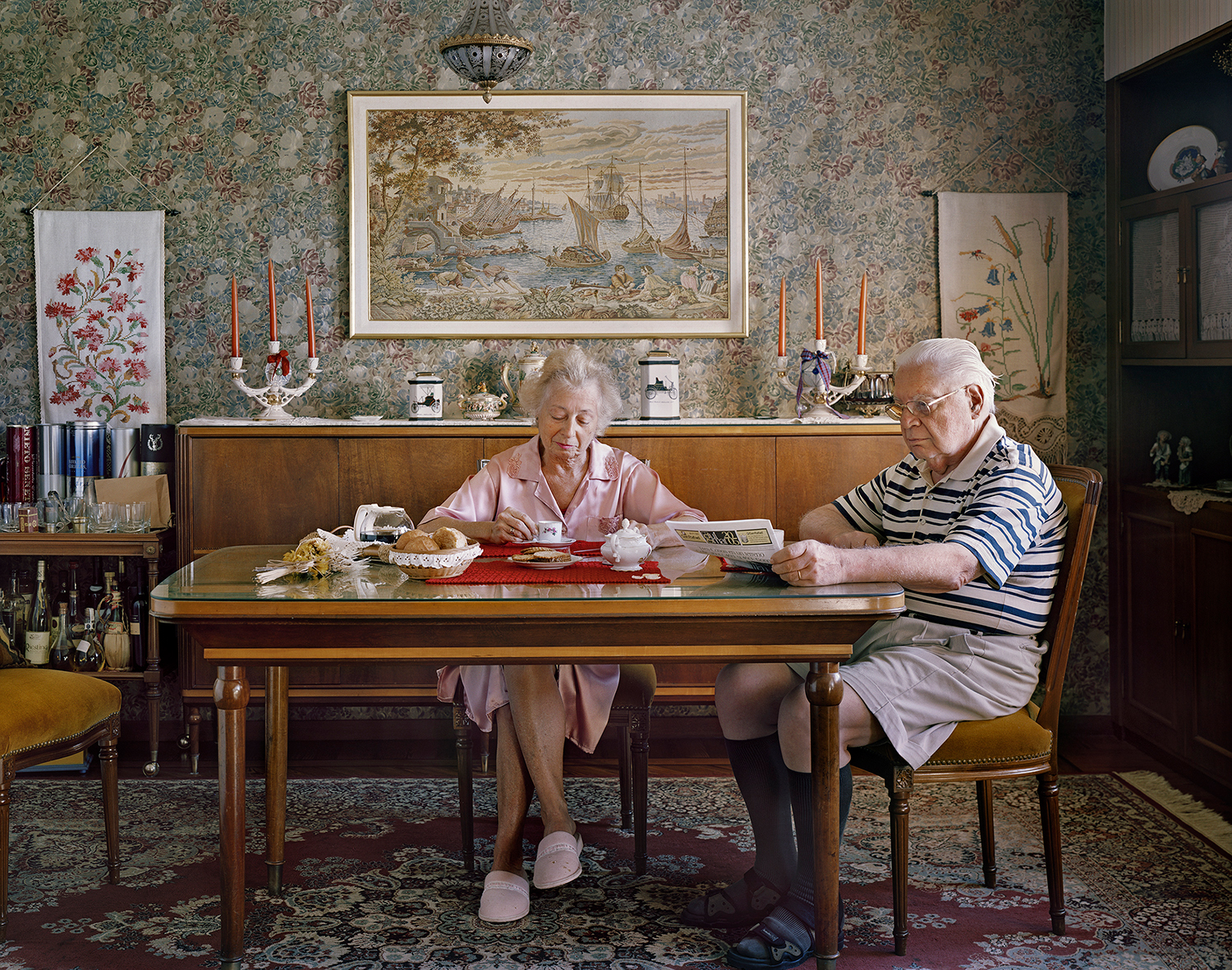 How long have they been sitting there in silence – he reading his morning newspaper, she lost in thought, gazing with a cryptic half-smile at the reflection in her coffee cup? The answer might be minutes, or decades. The stillness between them feels thick enough to cut with a knife, and yet behind this sedate breakfast scene lies a riot of colour and action: the floral wallpaper and wall hangings; the intensely patterned rug; a riot of maritime activity in the painting overhead. It throws their silence, companionable or otherwise, into almost comically sharp relief.