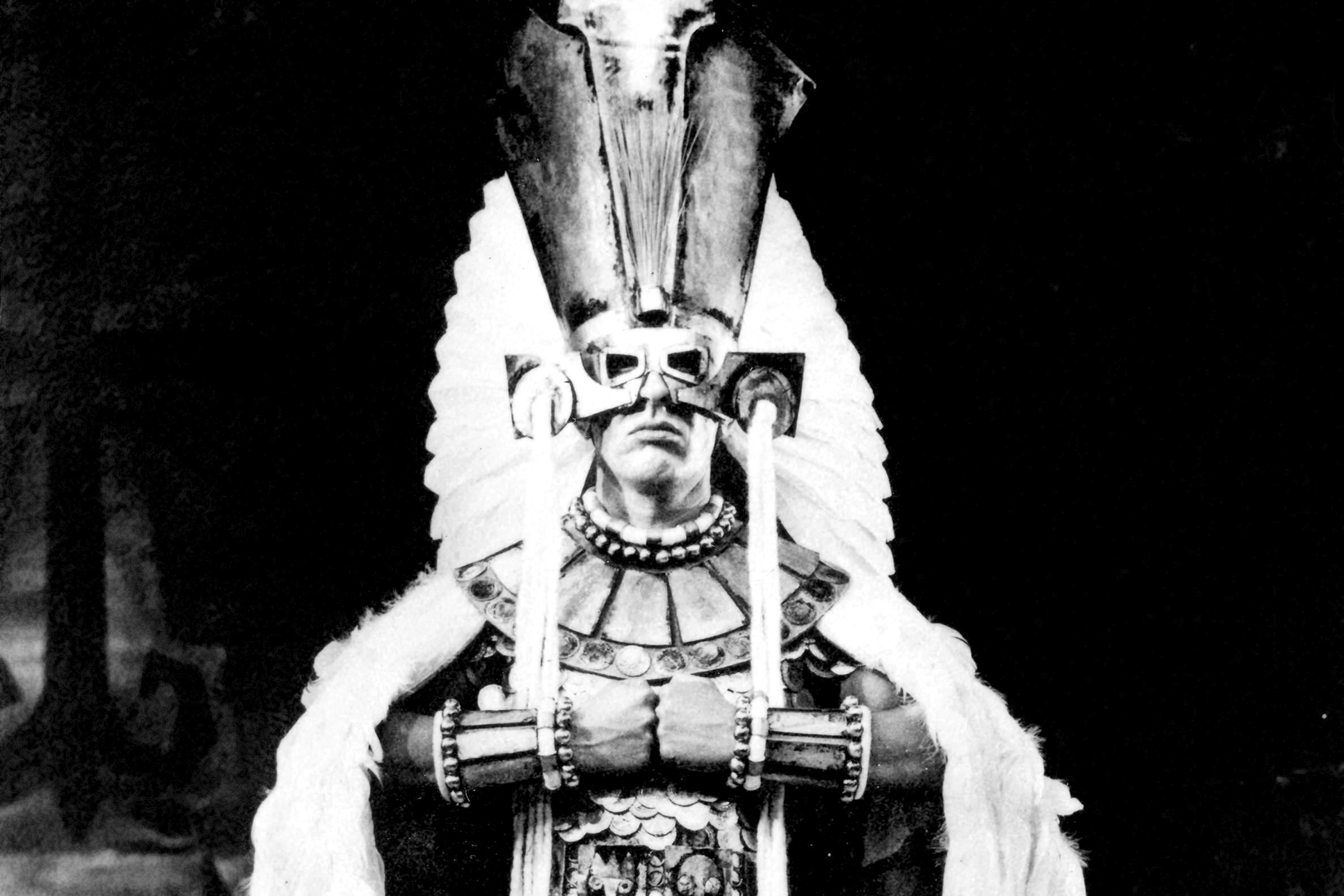 On a December night in 1964, an unearthly creation is revealed on the stage of Chichester Festival Theatre. Piercing shafts of white light. An immense metallic sun opens gleaming petals on to the figure of an eerie masked deity sheathed in white feathers. Glints of gold, a headpiece hinting at the pharaohs. Sounds of a tropical forest: haunting bird calls, disturbing feral howls, a deep humming resonating through the theatre.