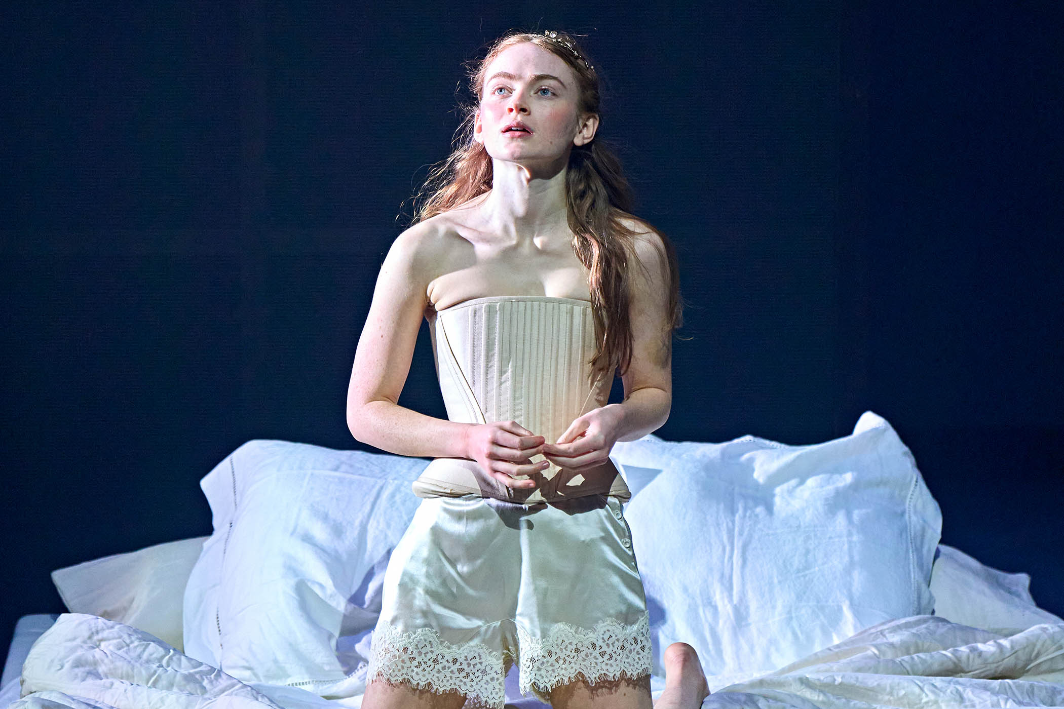 Star-crossed lovers of course, but also a cross star. I have never seen such a nervy, angry Juliet, one so skimming along on a wire of anxiety. Sadie Sink of Stranger Things is all angles, for much of the time exposed in camiknickers, once in a crimson sticking-out dress, something between a little girl’s party frock and a cocktail number. She bounces up and down on the bed that dominates the stage, wrestles with pillows like a boisterous 10-year-old, surrounds her words and gestures with a windmill whirl of hands.