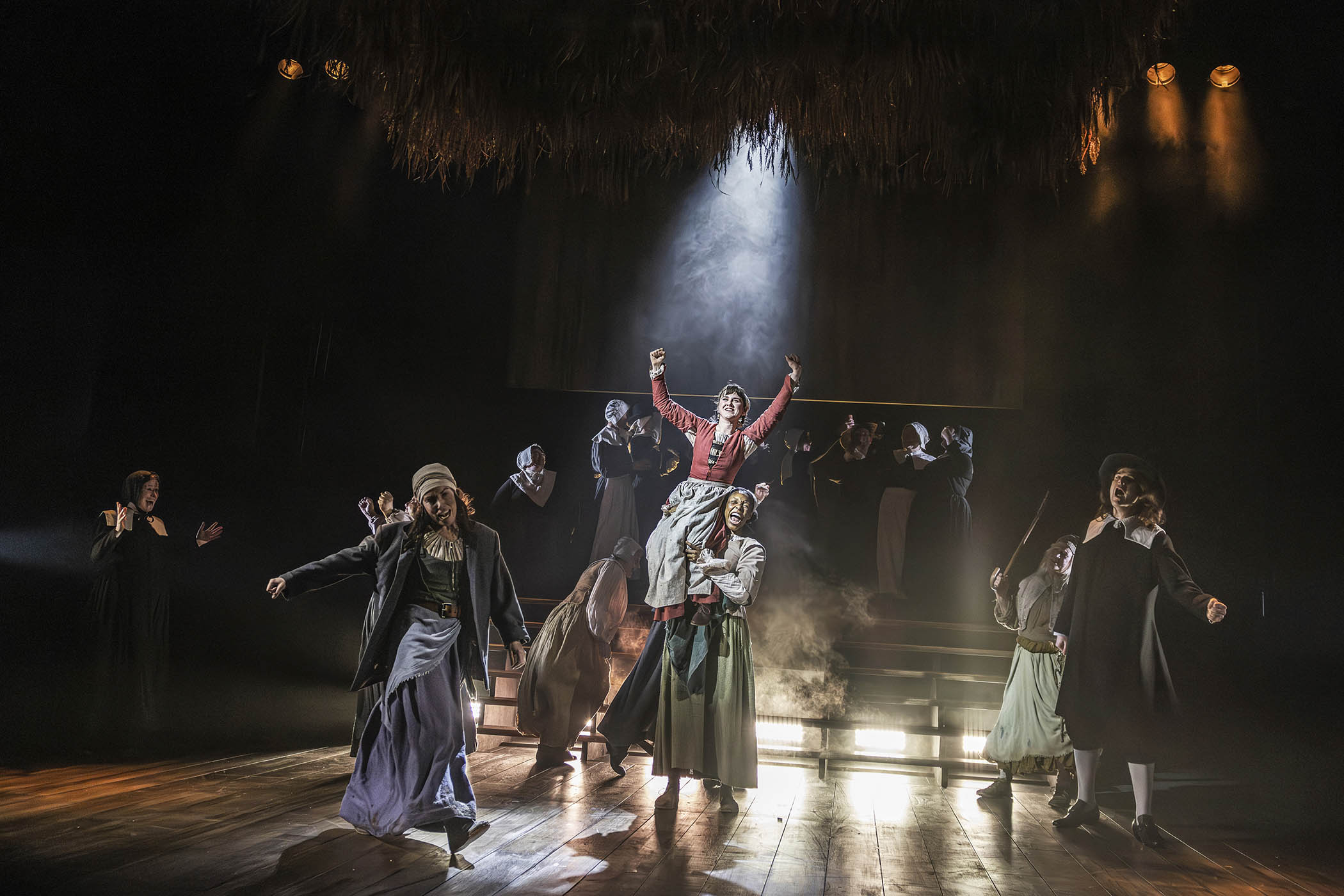 Director Natasha Rickman’s production works to bring out the strengths in the writing: its symbolism in Lucía Sánchez Roldán’s sharp-beamed lighting, contrasting clarity and obscurity, hazed by boundary-blurring smoke. Its atmosphere is in the mood-influencing music by Nicola T Chang, combined with Elena Peña’s space-expanding sound design. And last, but certainly not least, in its characterisations, crafted with impressive emotional integrity by each of the 11-strong cast (besides those already named, special mention to Fiona Branson’s disintegrating Bess Clarke and to Gabriel Agha as the “bewitched” child Thomas), supported by an exceptional community chorus of 17 (movement directed by Frantic Assembly theatre company’s Scott Graham).