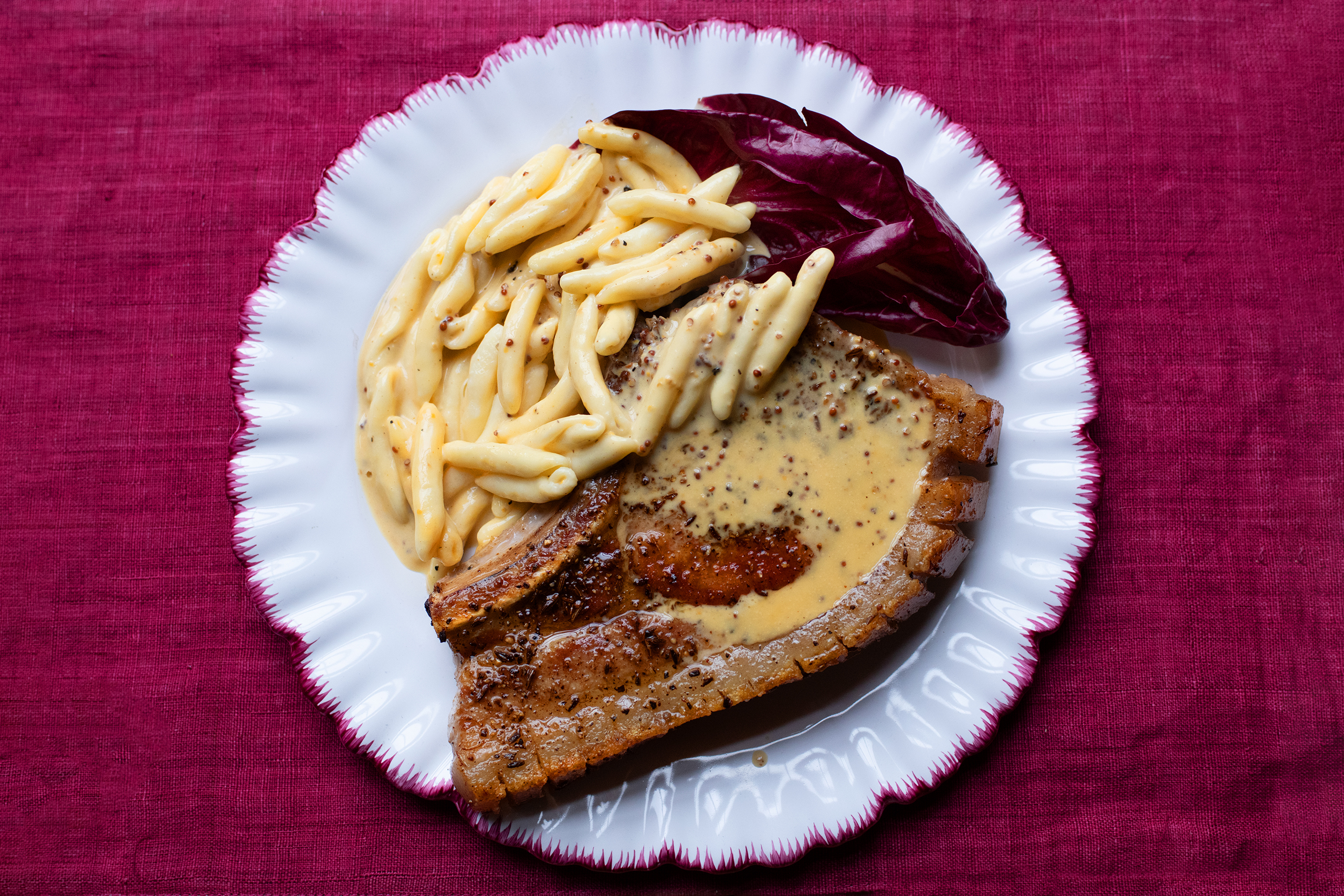 Place the chops on warm plates, lightly drain the spätzle, tip into the mustard sauce, stir briefly to coat the pasta with the sauce then serve with the chops.