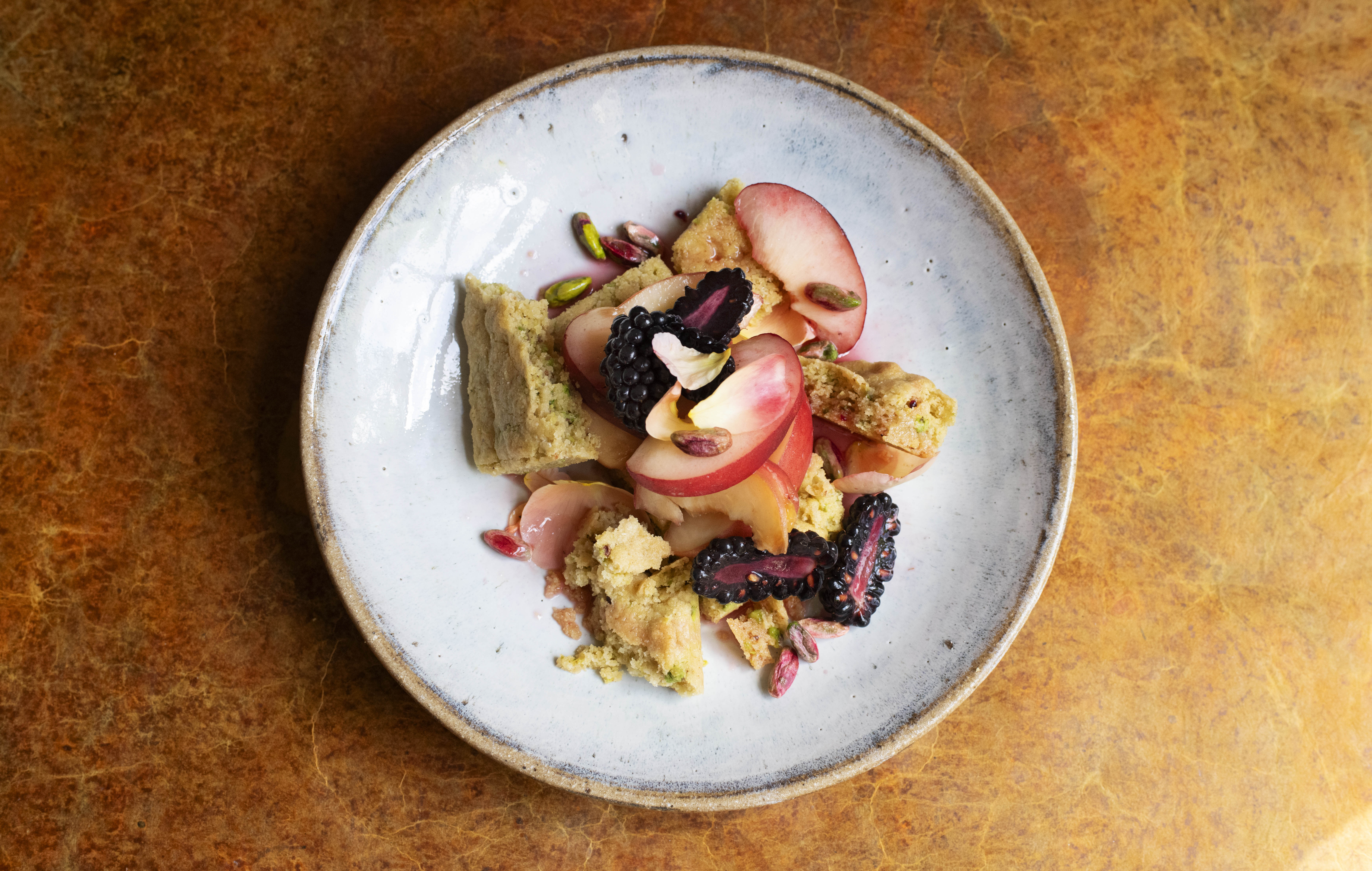 Halve, stone and then thickly slice 4 white peaches. Toss them with 250g of blackberries and 1 tbsp of sugar and set aside. Serve the fruits on top of the shortbread with some extra pistachios.
