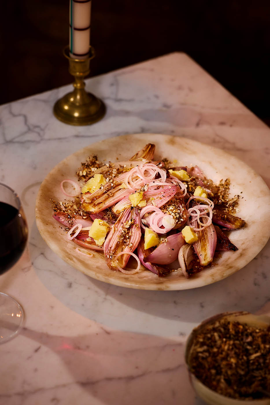 This cheese and onion arrangement will complement almost every other nibble on the table (calling it a “salad” is possibly a stretch). A heap of roasted shallots is topped with crunchy za’atar crumbs, quick-pickled shallot rings and shavings of sharp, aged cheddar.