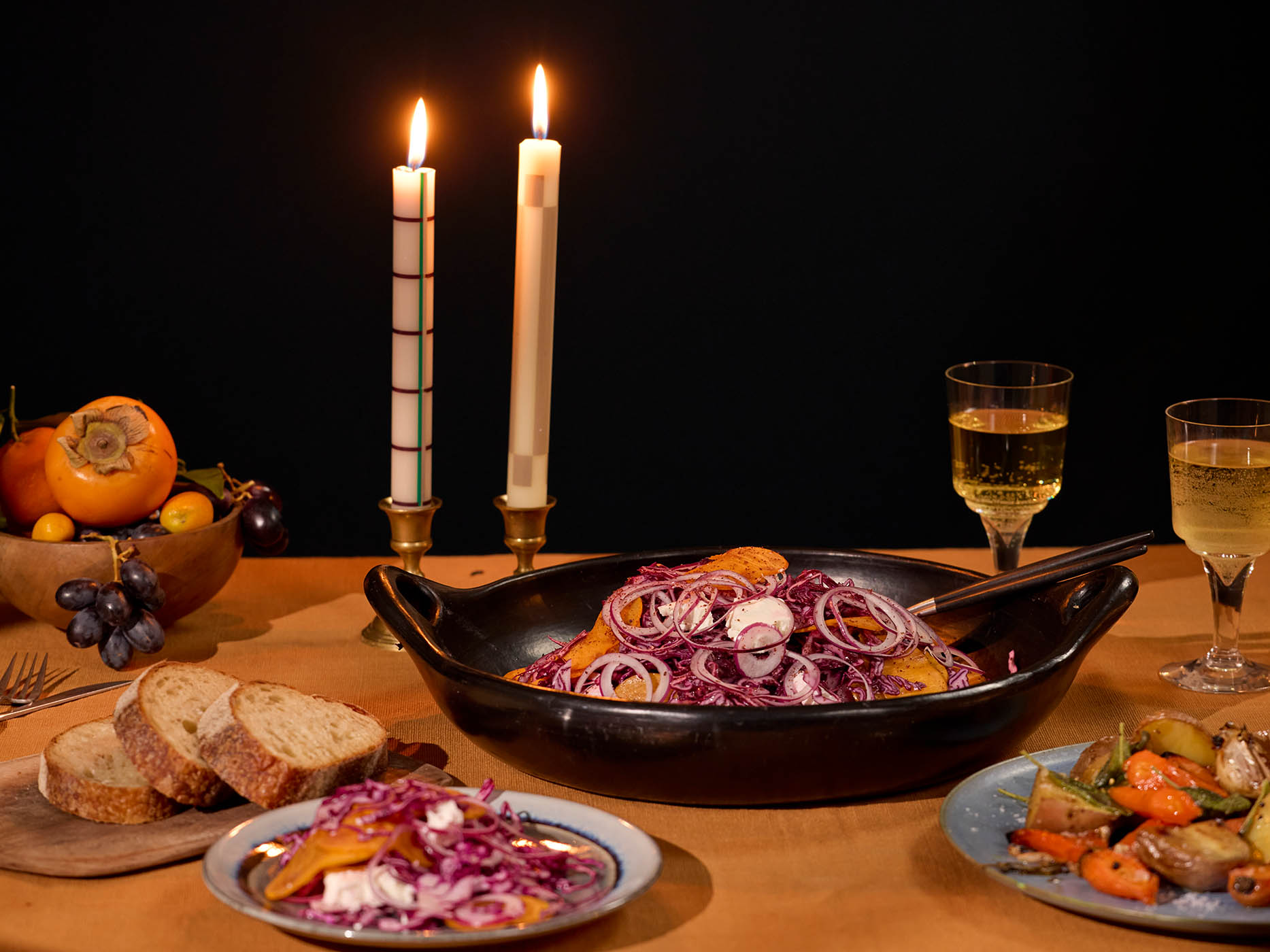 Serve your salad at the centre of the spread with tongs on the side for ease of plating: it’s much easier for people to pinch a satisfactory serving than wrestle straggled pieces with their forks. After all, this time of year is about relaxed, informal dining – with just the right amount of showing off.
