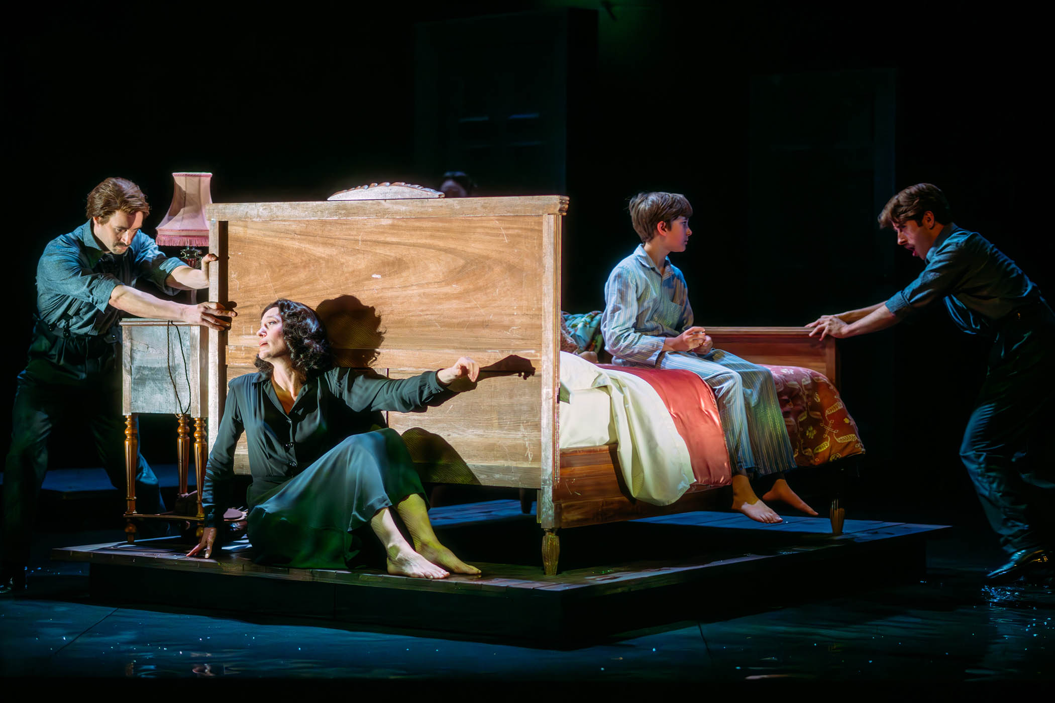 The Linbury staging, conducted by Bassem Akiki in a highly capable house debut, remains dark throughout, a degree of light enabling us to see the action but leaving plenty unknown. Video projections of the characters’ faces, outsized and watchful, add a visual counterpoint, as does the presence of two silent doubles of Quint and Jessel, who mirror their actions and emphasise the inescapability of these malevolent beings. Gradually, too, we realise that beds, desk and minimal other furniture, there to convey a country house interior, in fact stand in several inches of water: not so much a lake as splashy effluence.