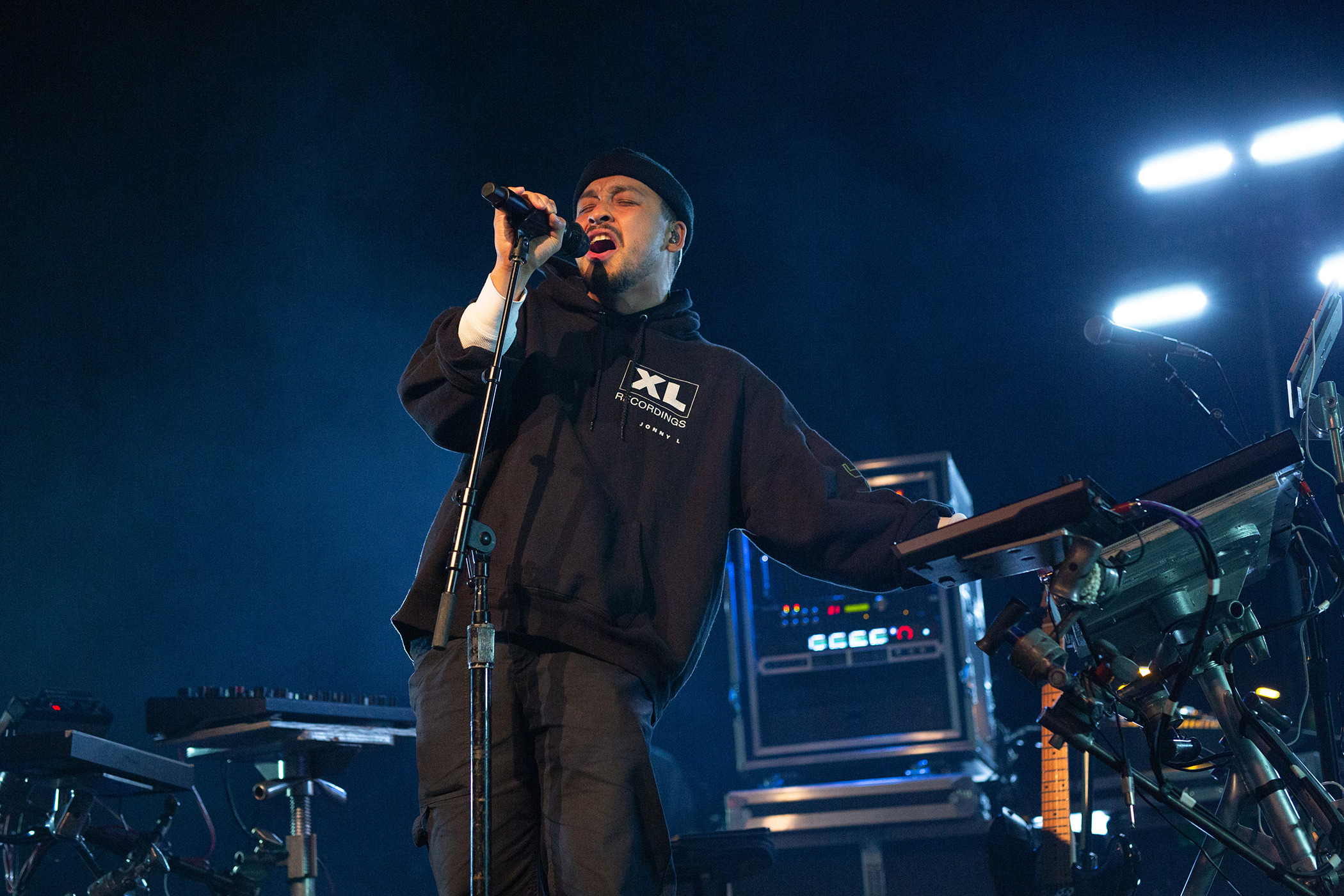 The task tonight for the singer and his band is to translate the giddy crunch of his studio-heavy music into live performance. There is an awful lot of gear on stage: Dijon ping-pongs between keyboards, guitar and consoles; his guitarist, Mike Haldeman, sits on a stool, sundry electronics arrayed like sunbeams around him. A mighty drummer, Henry Kwapis, and bassist Daniel Aged here provide funk and wallop in physical form, but bits of electronic sound also whiz past at speed.