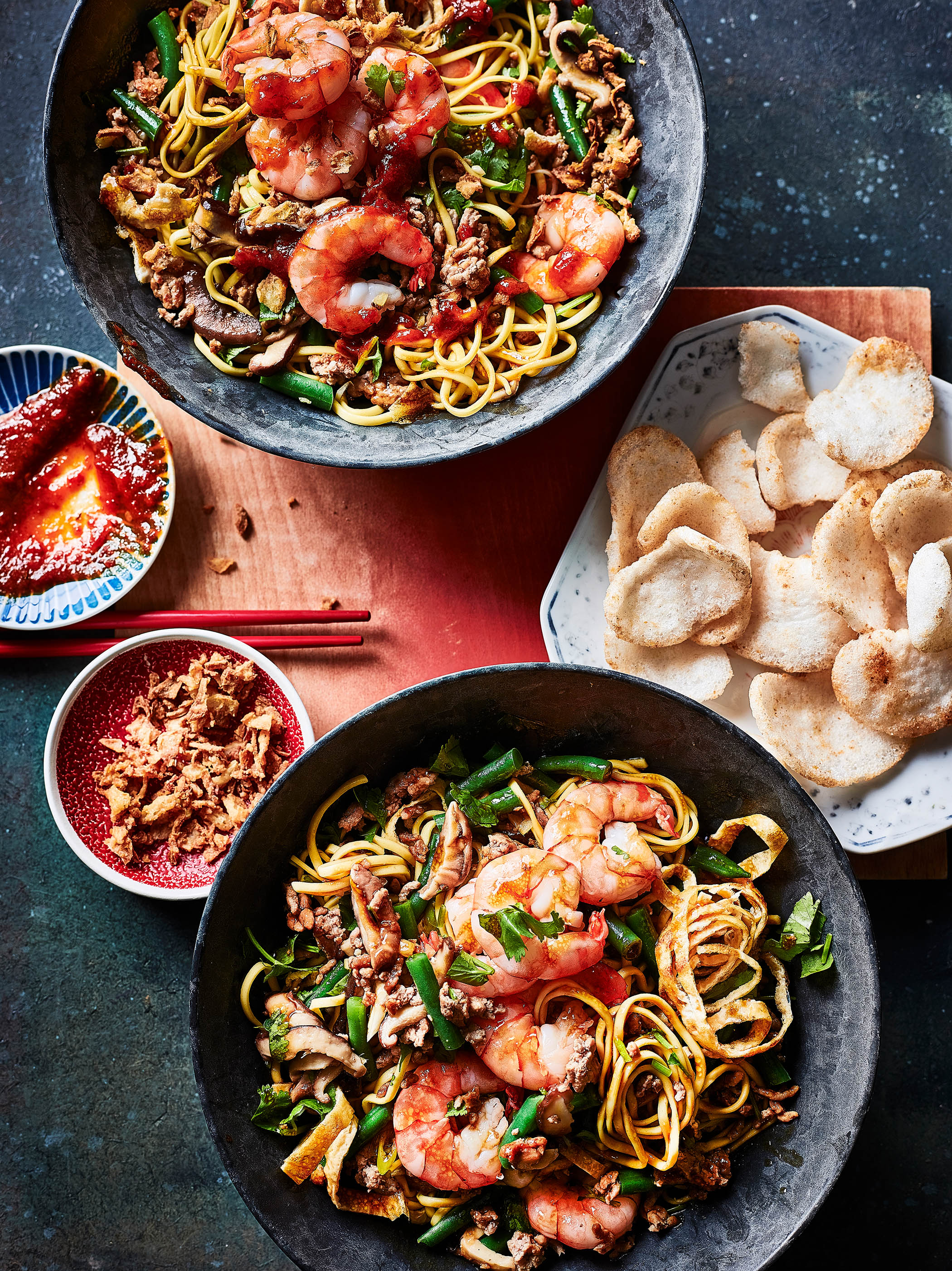 Divide the noodles between two serving plates and serve immediately with a sprinkle of fried shallots, sambal and a side of kerupuk or prawn crackers.