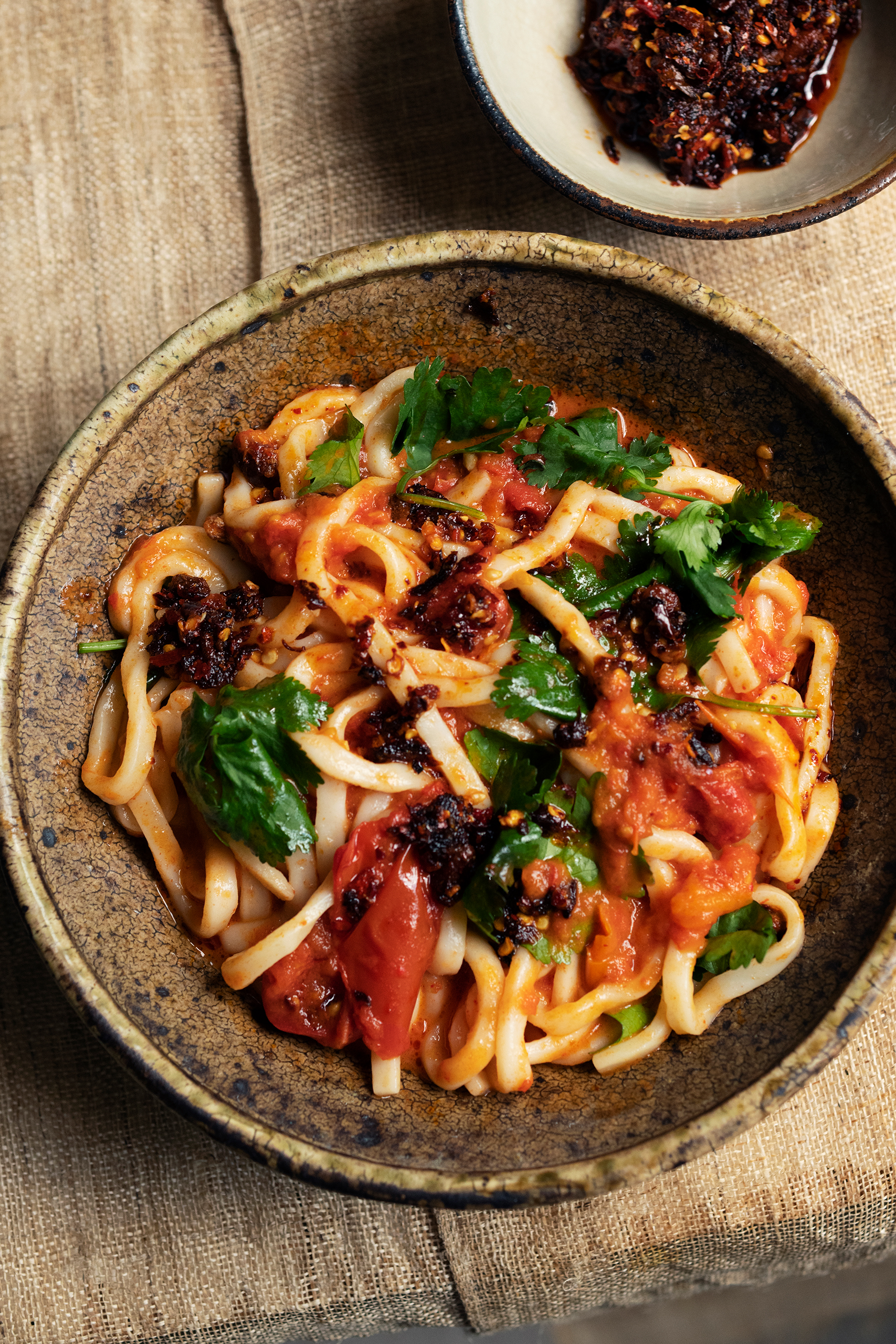 The warmth comes at you in waves – first from the steam rising from the noodles and their bubbling, brick-red sauce; then the crisp hit of the flaked dried chillies in oil – Lao Gan Ma – and lastly the deep warmth from the fresh, ripe chillies that have roasted with the tomatoes.