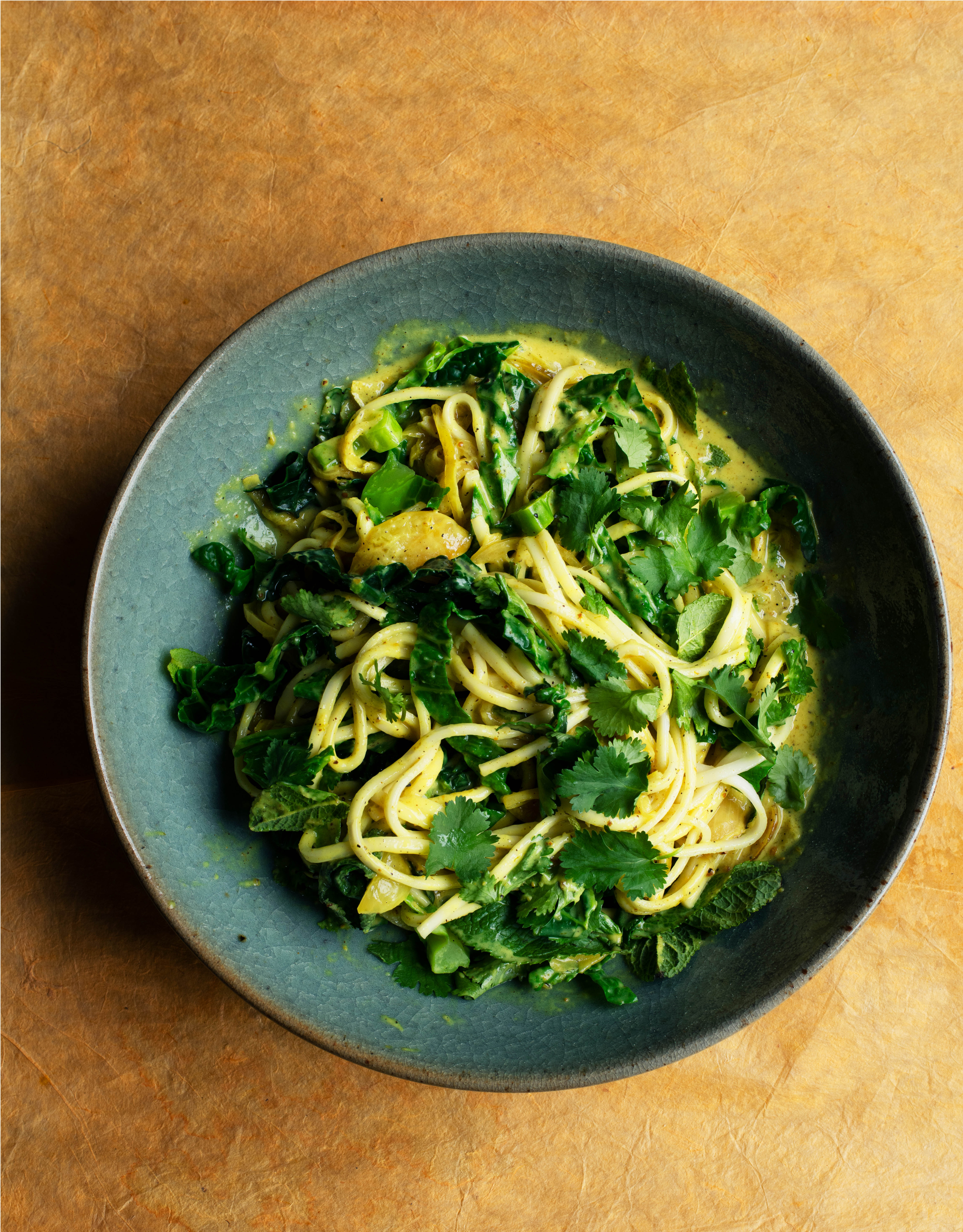 Pour in the coconut milk and bring to the boil. Shred the cabbage into ribbons the width of a pencil, then stir into the hot sauce. They will soften in the heat. Stir in the coriander and serve in large bowls.