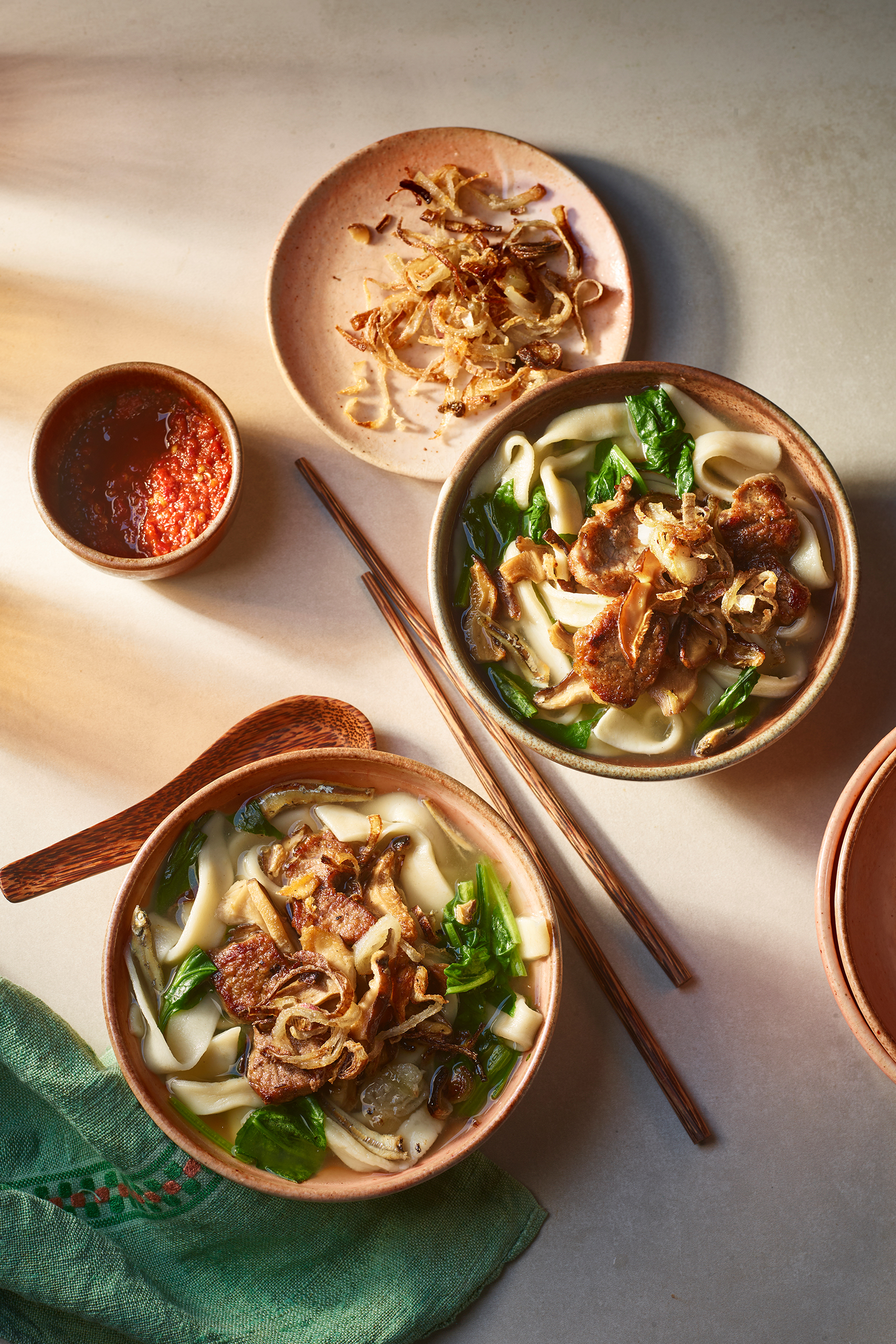 Pour portions into bowls and top with the pork and mushroom mixture and, if you have them, some crispy fried shallots.