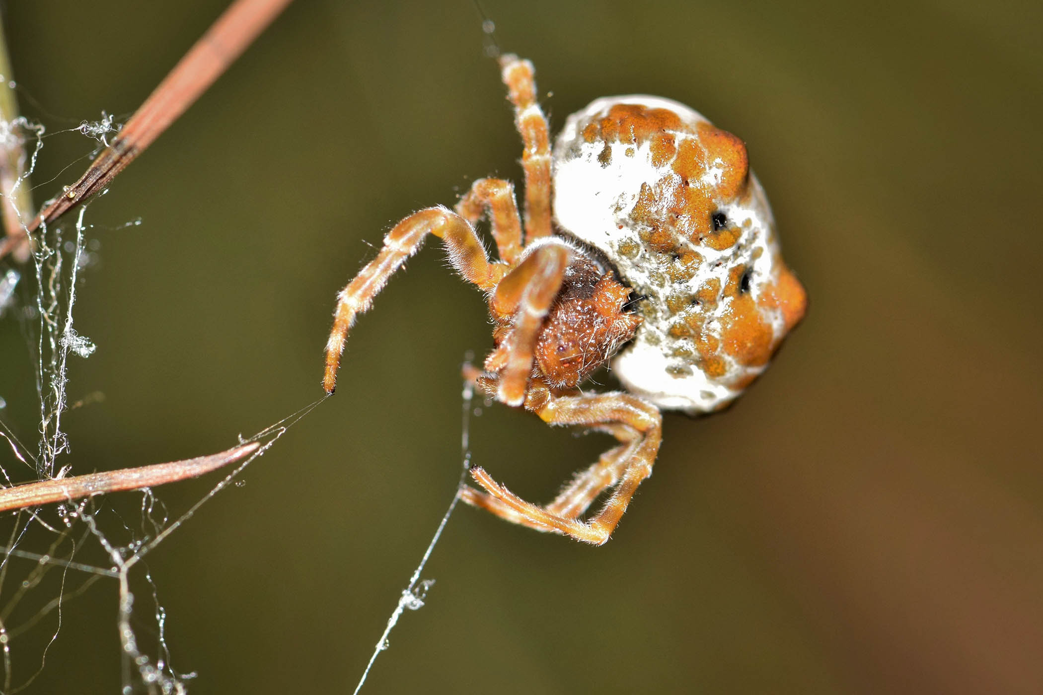 Every night I think another kind of silk into being and create a trapeze below the leaf I spent my day on. I’m quite an acrobat and with eight legs I’m spoiled for choice. I hang from my trapeze and there I nightly create my masterpiece: my bolas. It begins with a long – well, longish – strand of silk. “So what?”, you may ask. Ah, but it’s tipped with a silken blob of sticky goo. Woe betide any moth that comes in contact with it.
