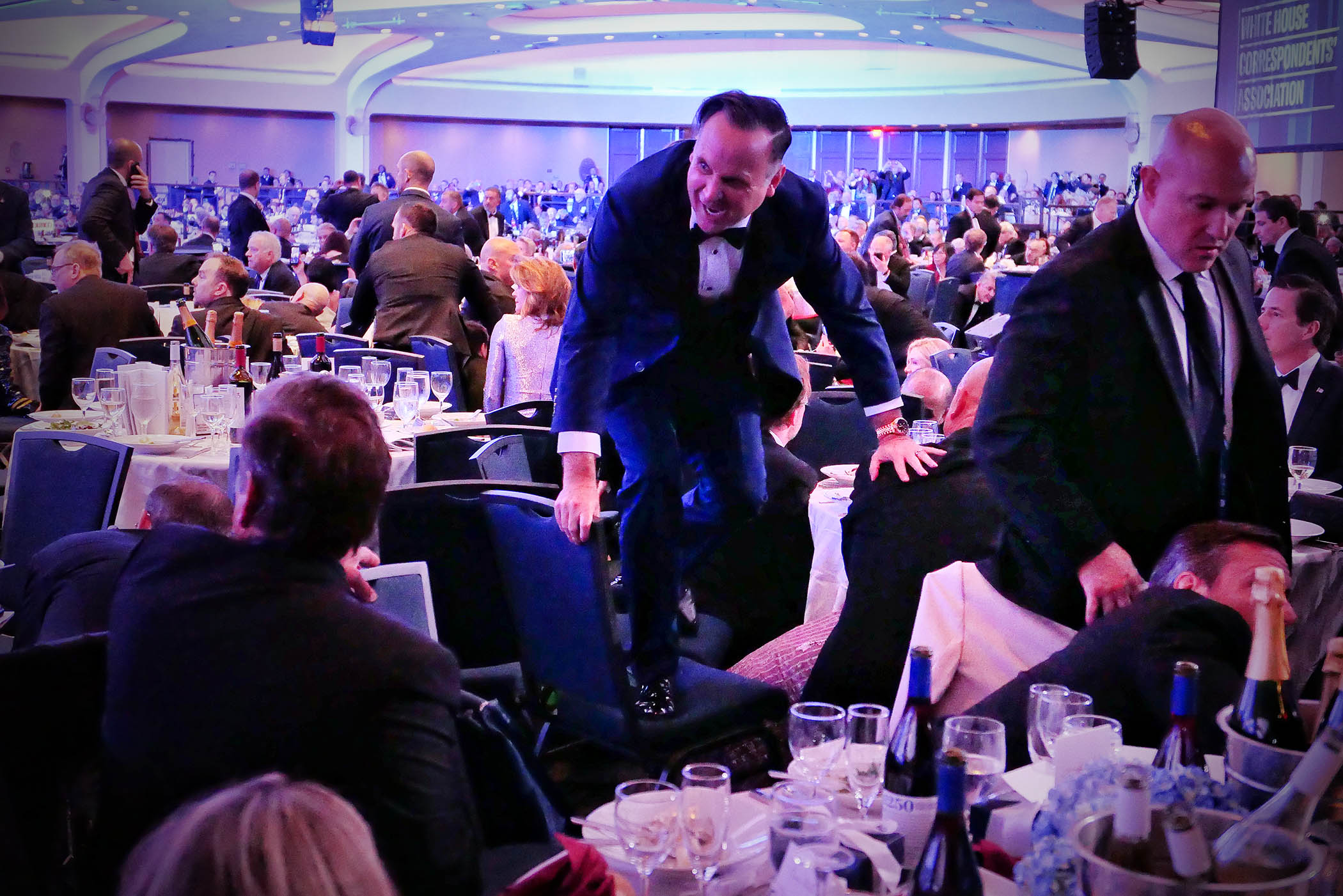 At least one shot was fired and one member of the Secret Service was hurt. But no one died, no one was seriously injured and, according to those present, an atmosphere of tense calm settled over the gathering of several hundred journalists and media executives as they got up from under their tables and set about covering a story unfolding in front of them.