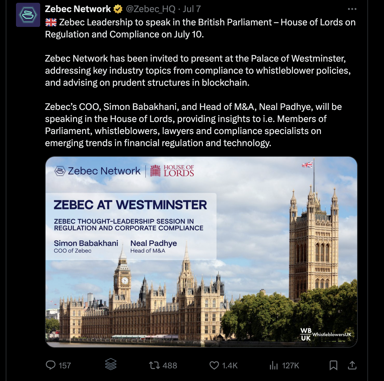 The post, which has been viewed nearly 130,000 times, included logos of the House of Lords, in breach of rules barring the use of parliamentary logos at external events. On one crypto news site, the announcement was credited with having boosted the company’s share price by 20%.