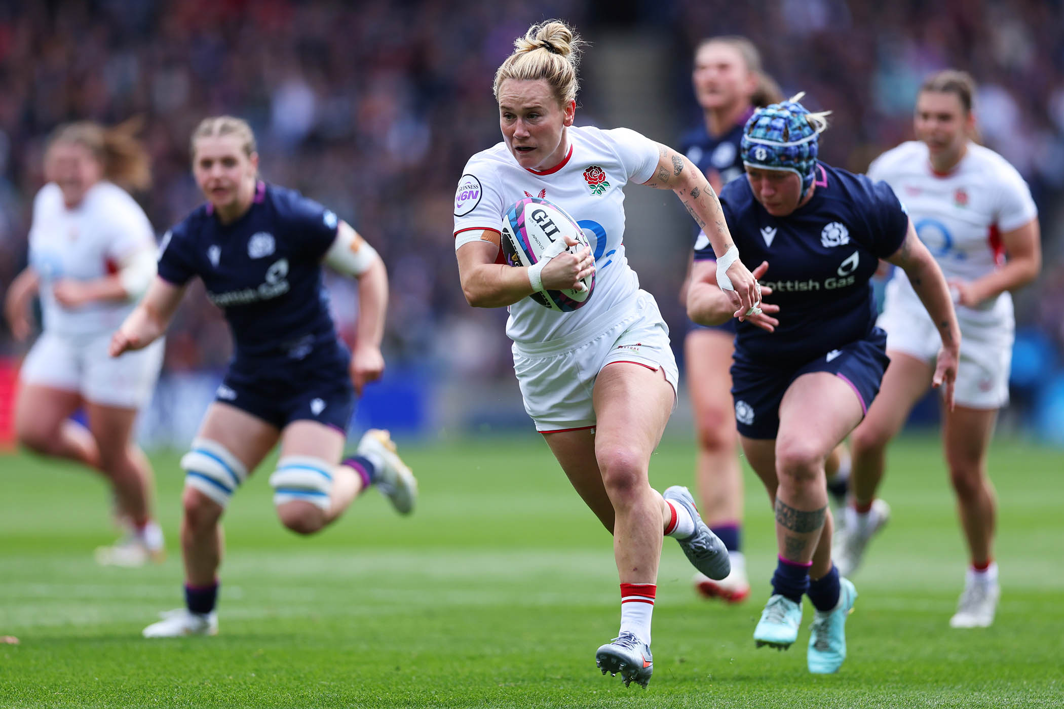 Two moments topped all of them. Seeing a young boy with his parents wearing a Scotland shirt with “Nelson 10” on the back, in tribute to Helen Nelson, the Scottish No 10 winning her 77th cap. And the way every one of England’s players greeted Maud Muir, who ran out to celebrate her 50th cap with a beaming smile, with the warmest of hugs after join her out on the field. Muir responded by bludgeoning her way into attackers in defence, and with one notably excellent line break where it looked as though she might fend off everyone north of the border.