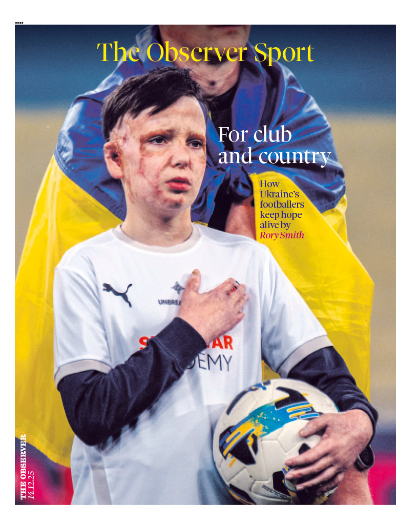 Palkin and Shakhtar have accepted the role, of course. What else would they do? They have played exhibition games across the continent, raising money not only for those displaced by the war but to raise funds to protect those left behind. “Social projects,” Palkin said, are now at the heart of much of what Shakhtar does. The club has championed the story of Roman Oleksiv, pictured on The Observer’s sport cover this week (below), who was eight when a Russian cruise missile struck the building in Vinnytsia, in central Ukraine, where he and his mother were waiting for a doctor’s appointment. His mother was killed. Roman survived, but suffered shrapnel wounds, a broken arm, and burns to 45% of his body.