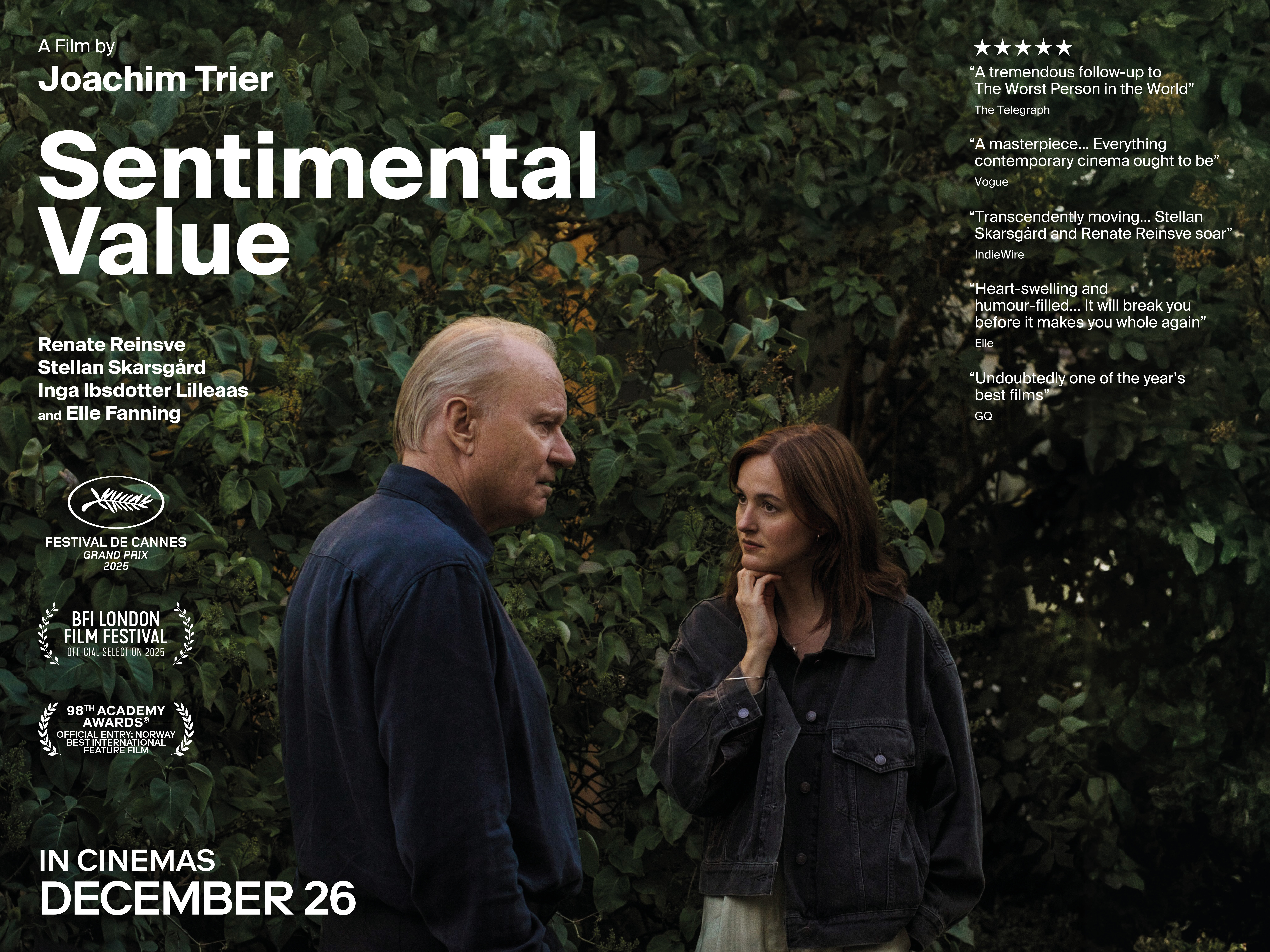 Sentimental Values follows Nora, a successful stage actress, as she reunites with her estranged father, Gustav Borg—a once-renowned film director planning a comeback with a script based on their family. When Gustav offers Nora the lead role, which she promptly declines, he turns his attention to a rising Hollywood starlet instead. Sentimental Value will be released in cinemas on 26 December 2025.