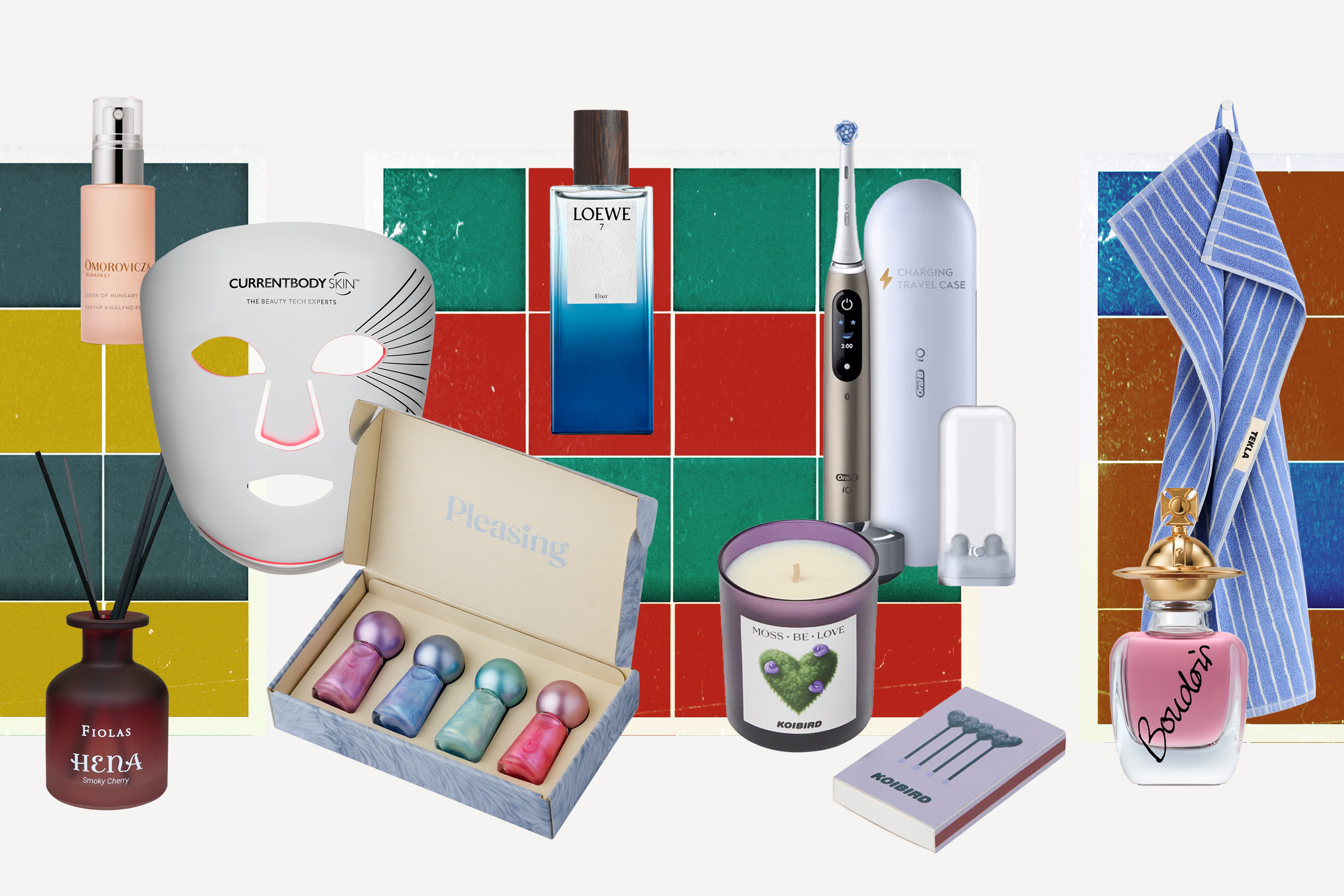 Gua sha massage tool, £35, Gloat. Aromatique hand balm, £27, Aesop. Mist and lip balm set, £49, Omorovicza. Slippers, £70, Allbirds. Red light therapy face mask, £399.99, Currentbody. Bath towel, £80, Tekla
