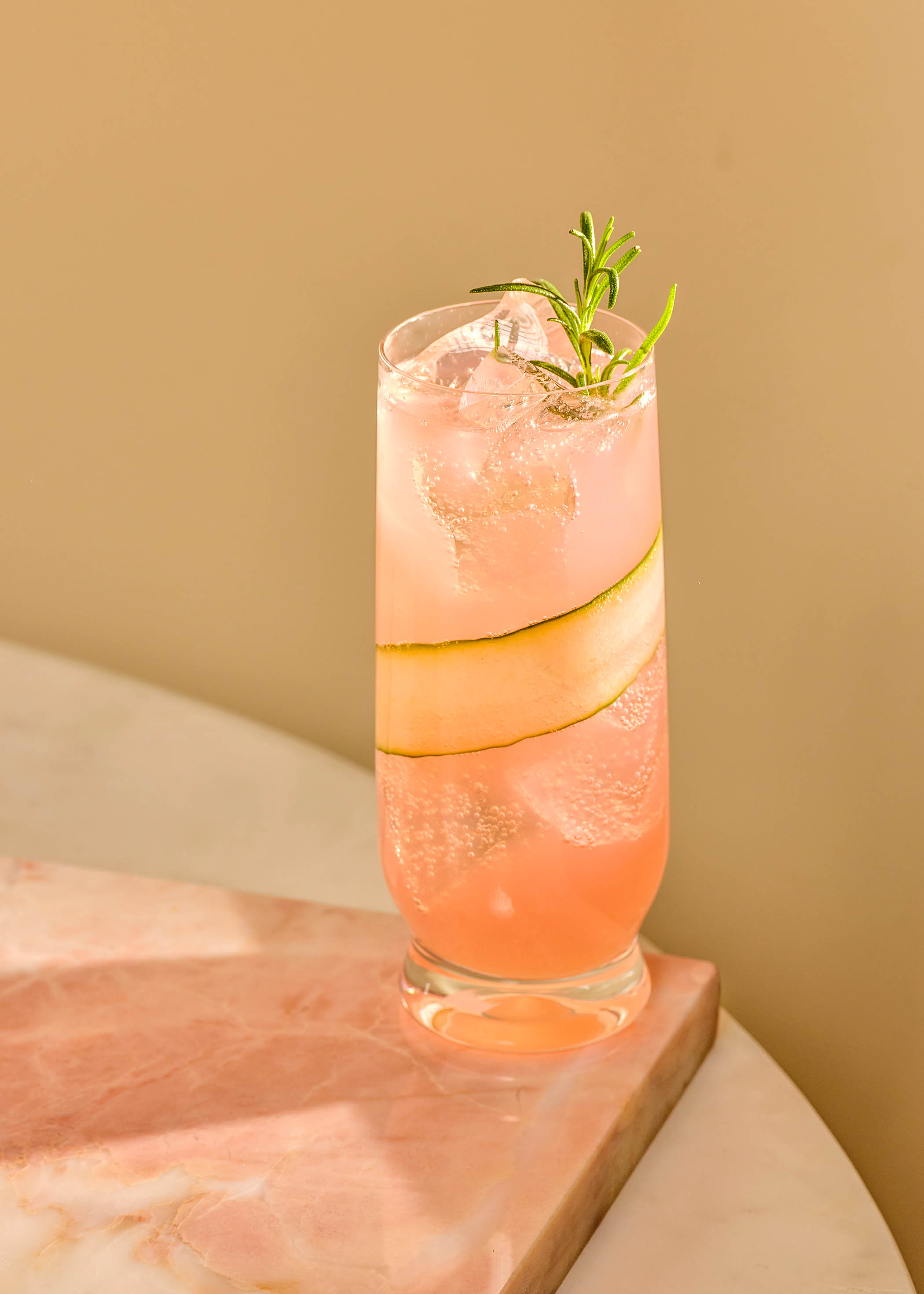 Add the ice to a tumbler. Roll the lime on a work surface to soften, then squeeze all its juice over the ice. Add the grapefruit soda and bitters (and gin, if you are using), then stir a few times. Garnish with the cucumber strand, curling it around the sides of the glass, and finish with a small sprig of rosemary on top.