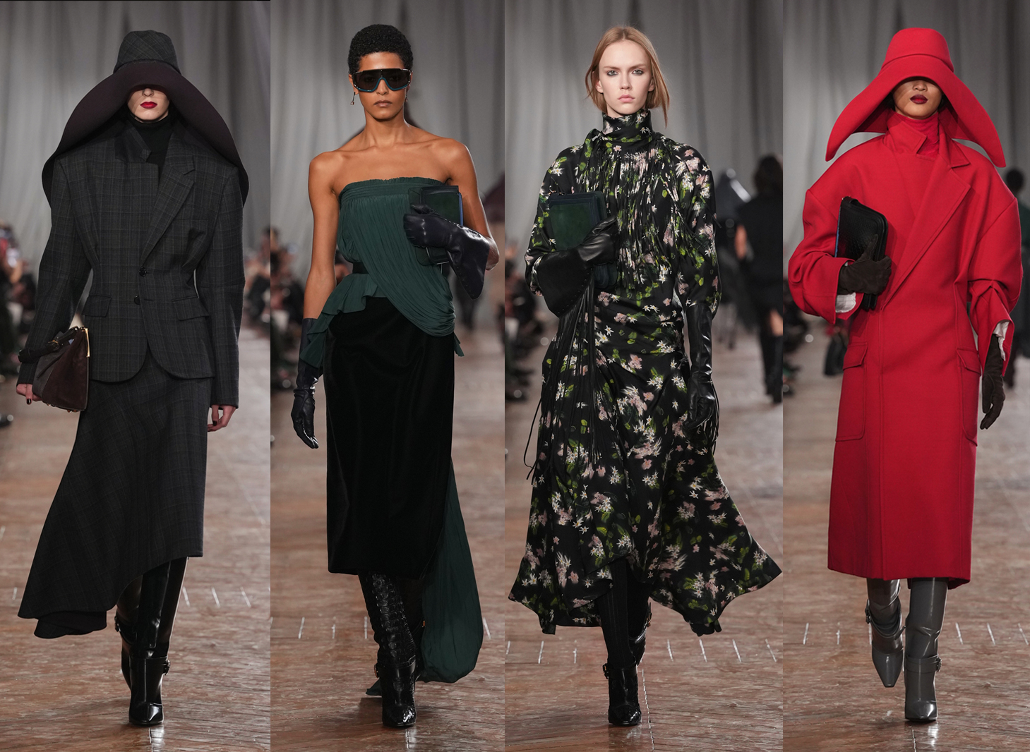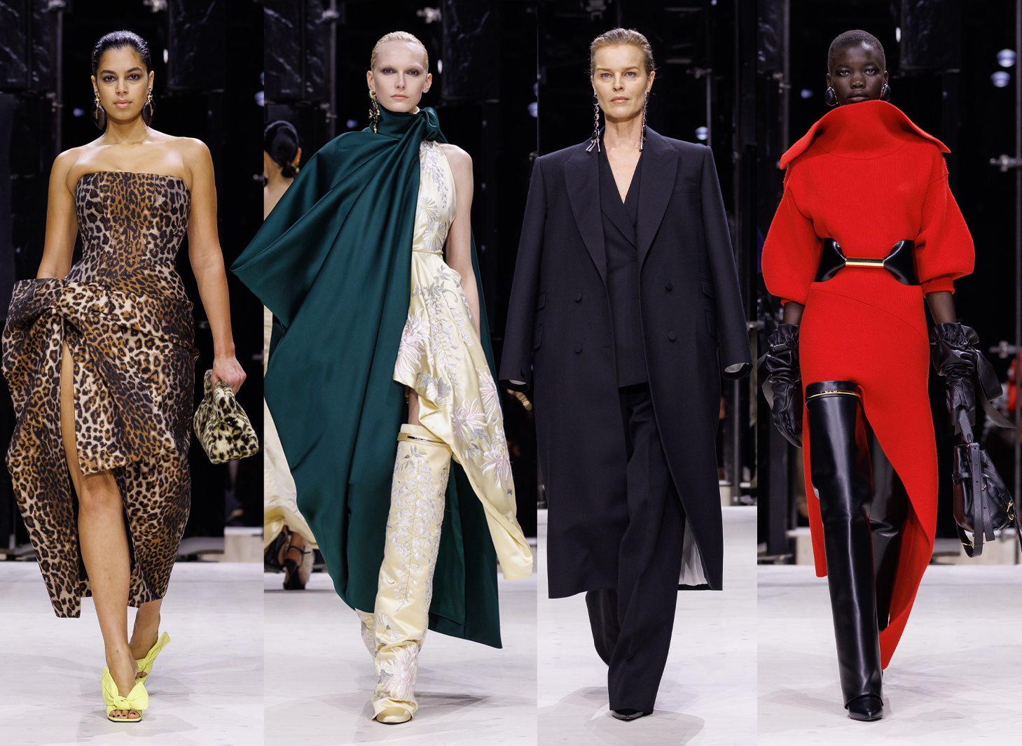 Sarah Burton's vision for her third Givenchy runway show became clear as soon as the first few models stepped onto the runway. The designer was in a confident and comfortable place at the house and had hit her stride. Opening with tailoring that evolved beyond hourglass silhouettes into exquisitely cut, androgynous, double-breasted trouser suits, Burton was laying down her codes for the house, at the top of which is her unwavering and intuitive vision of the Givenchy woman. This was evident in the show's diverse casting; she is not one type of woman, but rather all sorts of women. Within the collection, each silhouette had its own individual character. Strict sartorial precision gave way to fluid draping, with duchesse satin capes, a precision-cut velvet gown spliced to the hip, and waists cinched in with belts. Sculptural pieces added form – a lace dress with plunging necklines and stiff sculptured skirts, a head-turning, reversed red dress with a plunging back and a high collar that swept up at the front. Print introduced animal print and a 20s floral flapper dress. The silk headwraps, designed by Stephen Jones, drew inspiration from T-shirts pulled up over the head in haste.