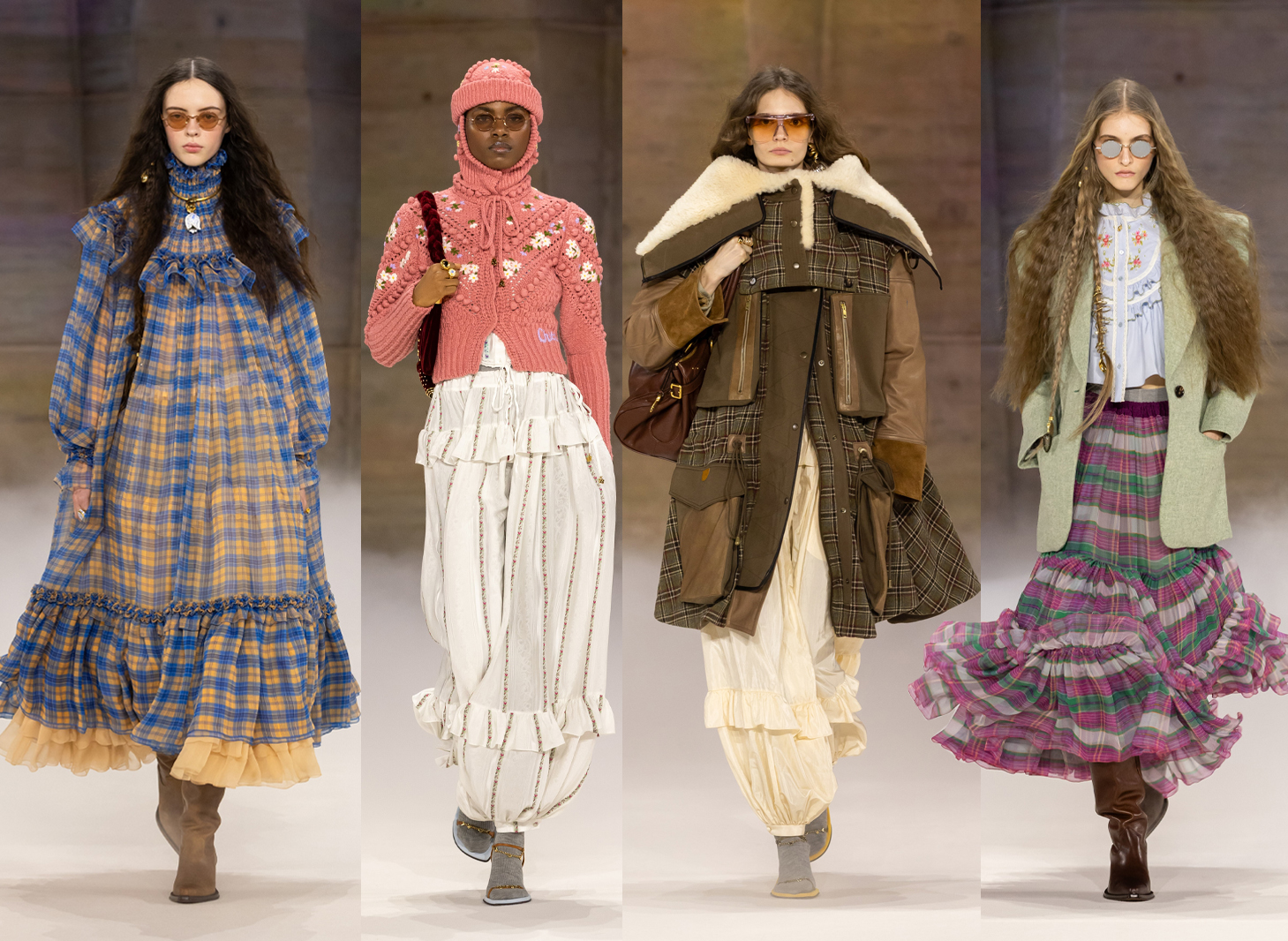 Creative Director Chemena Kamali was inspired by the beauty of traditional folk costumes and the skill of the craftsmanship that goes into the garments. Exploring these ideals: handcrafted techniques, togetherness and her fascination with the community of artisans who create using traditional methods; the time, effort and devotion invested. Kamali cleverly merged the Chloe-girl free spirit with folksy looks that still retained the French cool-girl aesthetic. Hand-knitted and hand-embroidered blouses, along with hand-painted jewelry were evidence of the workmanship within the collection. Flouncy, tiered, ruffled mousseline skirts were teamed with the signature Chloe broderie anglaise breezy blouses, worn with hand-knit Tyrolean sweaters, each with its own charm and homespun appeal. Light trapeze-line dresses were voluminous and came in faded check and ditsy floral prints. The quilted prairie skirts and blanket coats featured trails of fringing, while the capes and oversized parkas will definitely find a home in the wardrobe of Chloe fans.