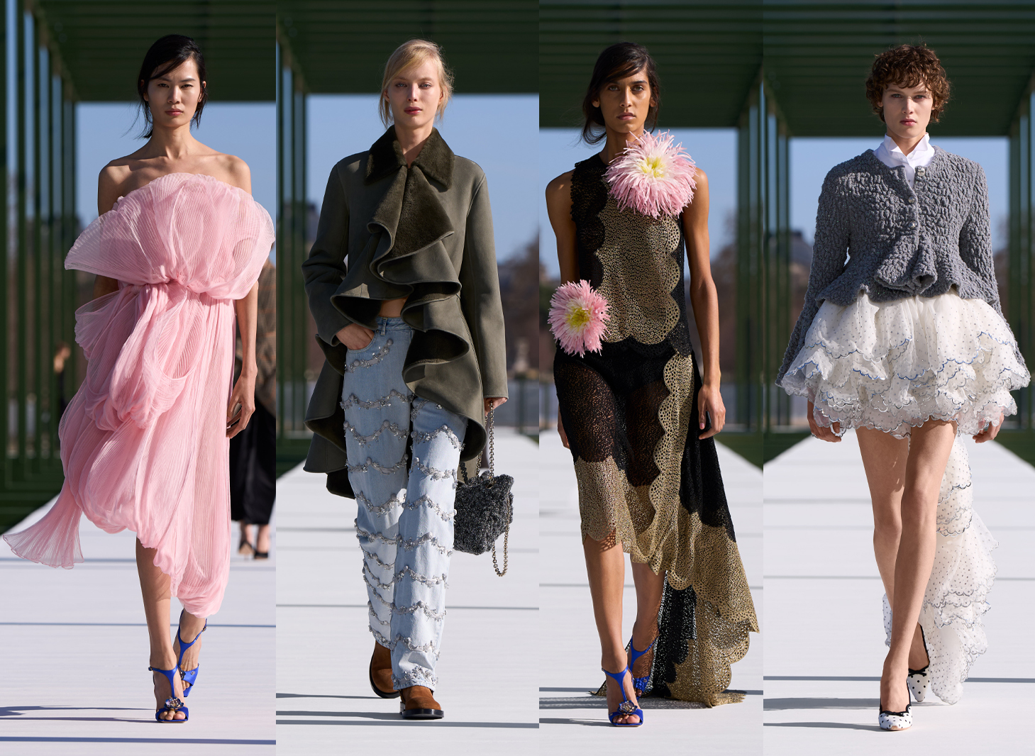 Jonathan Anderson turned the Dior show venue in the Jardin des Tuileries into a Parisian park promenade complete with lily pond. “I was interested in the idea of pleasure gardens, of dressing up and the idea of going to a garden to be seen,” said the designer. Anderson is the first creative director of both men’s and women's wear at Dior since its founder. A year in he has four collections under his belt; The latest outing crystallised his vision and raised the bar. Anderson’s desire was to break with the past and create something fresh. Opening looks were led by the Bar jacket, shrunken and cinched at the waist with scrolled peplums that sat precisely atop a tiered skirt, with layers and layers of frills trailing down the back. This was mastery at work, with fabrication at the forefront. A print jacket was handcrafted with a cluster of three-dimensional flowers; another, a skirt with a single flower motif swathed the body. Denim was peppered throughout the show edged with crystals or beaded and embellished. Flounces of chiffon burst from the hems of dresses and delicate tutu skirts were edged with silver sequins.
