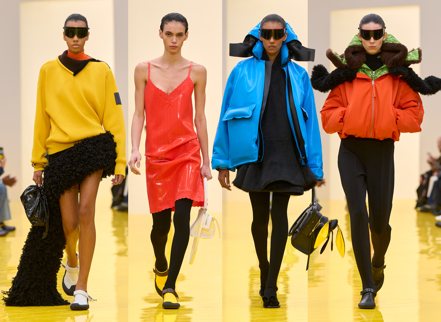 This was Jack McCollough and Lazaro Hernandez’s sophomore show for Loewe. This season was playful and full of punchy colour. Scattered amongst the seating were Cosima von Bonin, an artist the designers had long admired, and her giant sculptural animals –googly-eyed clams, a seated dolphin, a floppy-eared dog hinted at the show's playful mood. Craft is at the heart of the duo's designs; high-tech techniques and fabrication clearly show the direction the designers are taking the house. The show kicked off with slip dresses and pyjama tops accented with lace, reimagined using a 3D-printer and cast in latex. The same effect was applied to coats and detailing on sleeves, pockets and fastenings, moulded to create a trompe l’oeil effect in latex. Sporty parkas for men and women featured inflatable panels and exaggerated sou'wester-shaped hoods. Leather macs had inflatable pocket flaps and blow-up gingham skirts and scarves were worn with tailored coats. Leather string was knotted into a textural fringed coat while lengths of beaded rope formed looped dresses. Knitted mini-dresses with trailing textured trains and tailored wool coats were accessorised with fun inflatable scarves, finished off with Loewe wellies.