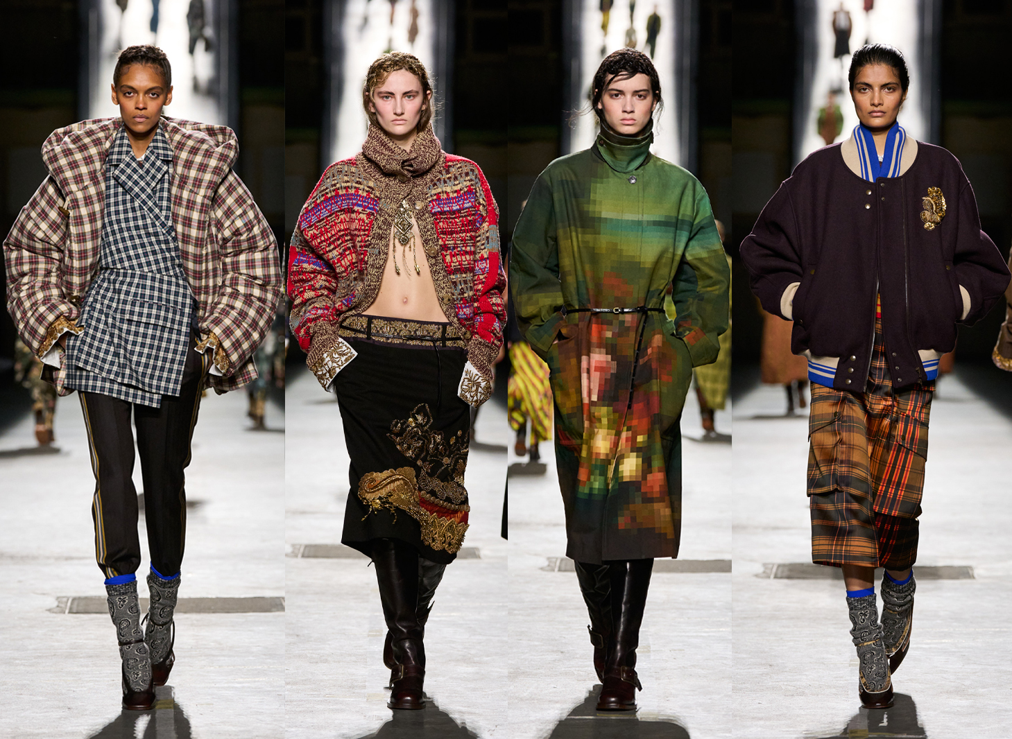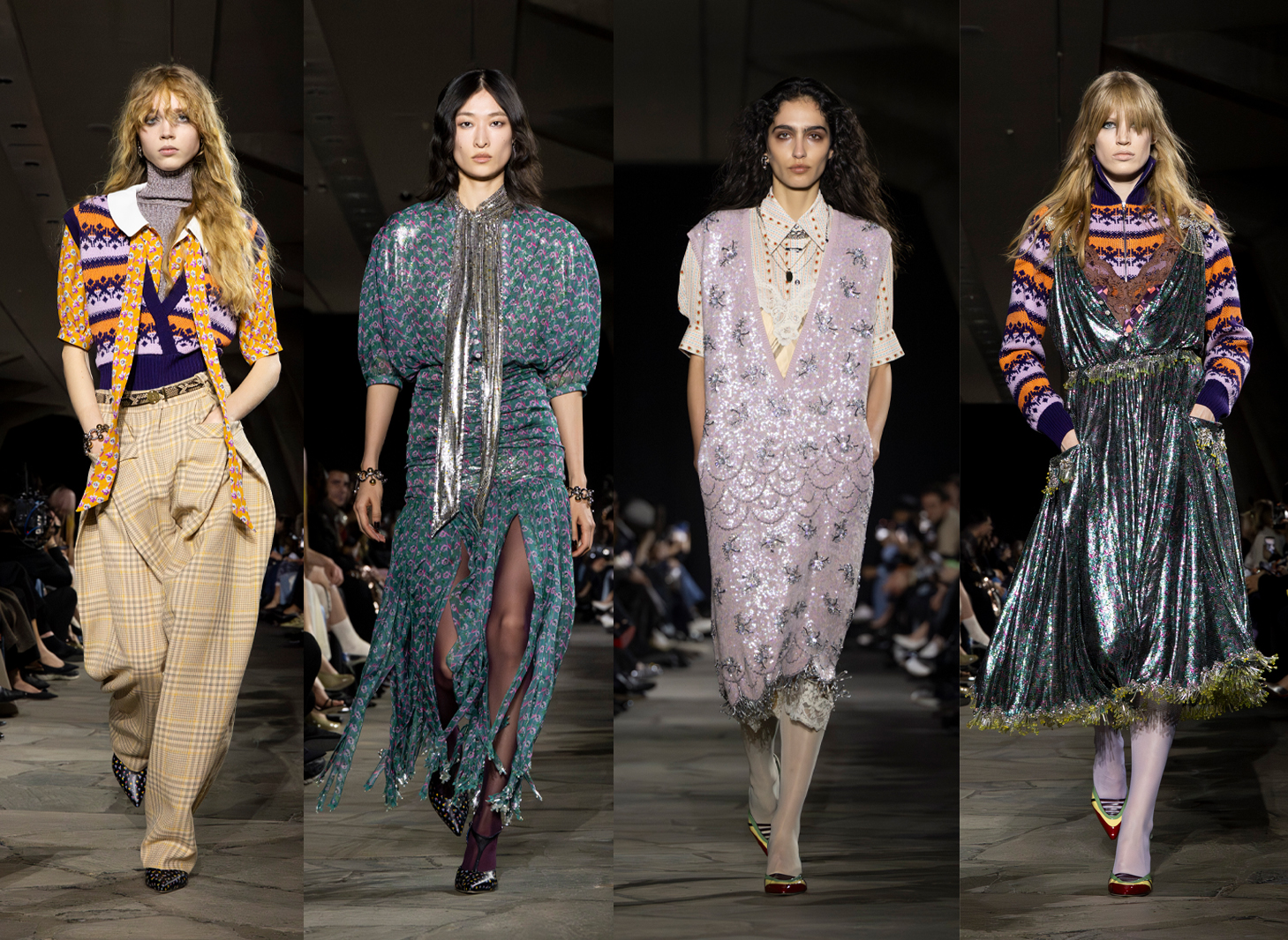 Rabanne's creative director, Julien Dossena, has a fondness for 1940s tea dresses; this season, the runway was peppered with vintage-look styles. They came decorated with sequins, dusted with crystals and layered over, or under joyful, brightly coloured Fair Isle knits. Shearling intarsia jackets, a bookish check suit with the blouse open, exposing an underslip. Dossena's Rabanne woman had a "tough femininity, not polished," portrayed by the speed and confidence with which the models walked the runway, hands thrust into pocket - one in men’s plaid trousers paired with a floral blouse and brightly coloured Fair Isle sweater vest. Another wore a draped flower-printed metal mesh top with a draped skirt of deconstructed, fringed jersey encircled with tiers of mini metallic tubes that jangled as it swept by. This was a lesson in layering, not just the garments but the decoration that showered the show, including one twinset fully embroidered and beaded with small flowers that was grounded by a pair of stylised cowboy boots, followed by a leather trench, T-bar pumps and contrasting tights teamed with a skirt that swished with each step. Cleverly, Dossena's layering was the perfect device for showing as many of the house’s offerings as possible.