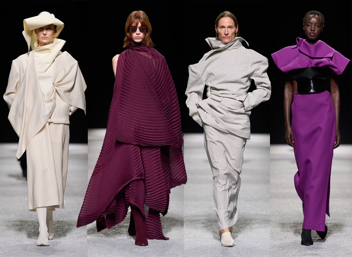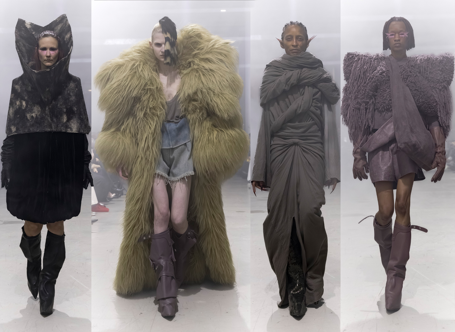 Rick Owens’ AW26 collection, titled “Tower”, drew inspiration from the prayer dedicated to love and hope: “Temple of love, tower of light.” The designer created a collection of towering looks, reflecting on the state of the world, with each look signifying a beacon of humanity. Elongated glossy leather strapless sheath dresses opened the show; others came in boiled wool and Kevlar, the protective fibre that’s five times stronger than steel and is used in body armour. Owens included the material in a direct response to the violence and war happening in the world. Tall proportions were created by layering cropped jackets – in waxy cowhide, fluffy alpaca and boiled wool – over long vests. Each model towered above the audience as they walked, balanced on pointed platforms. Quilted capelets with high funnel collars and leather jackets with powerful shoulders and draping that swathed around the body created strong silhouettes. Owens closed the show with a series of gigantic proportioned shaggy goat-hair coats that engulfed the body.