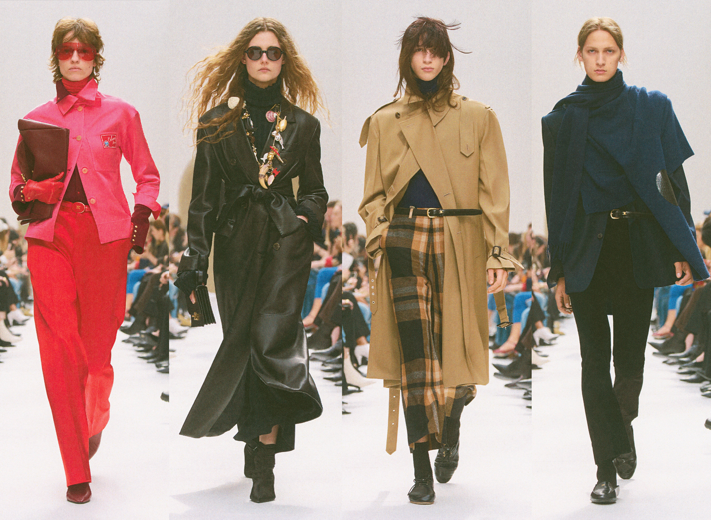 Now in his third season at Celine, Michael Rider has established himself as a creative who quietly sets the tone of fashion in a very real way. Those details of how clothes change – when your trousers suddenly, seemingly overnight, become the wrong length or the fit of your jacket is off – they start here. (Sidenote: the oversized fit is on the way out.). “Sharpening the pencil,” as Rider referred to it in his notes. After the show he elaborated further backstage, describing the look as “zippy,” explaining he wanted more “bite”, and that it’s about “controlling the fabric and letting the person come through”. The result was a freshness that moved away from preppy with a collection that included 50% all-black looks (the headline trend next season). Elsewhere, pops of bold colour came in a purple leather trench, a faux-fur leopard-print coat and bright red pants styled with a hot pink shirt over a form-fitting roll neck.