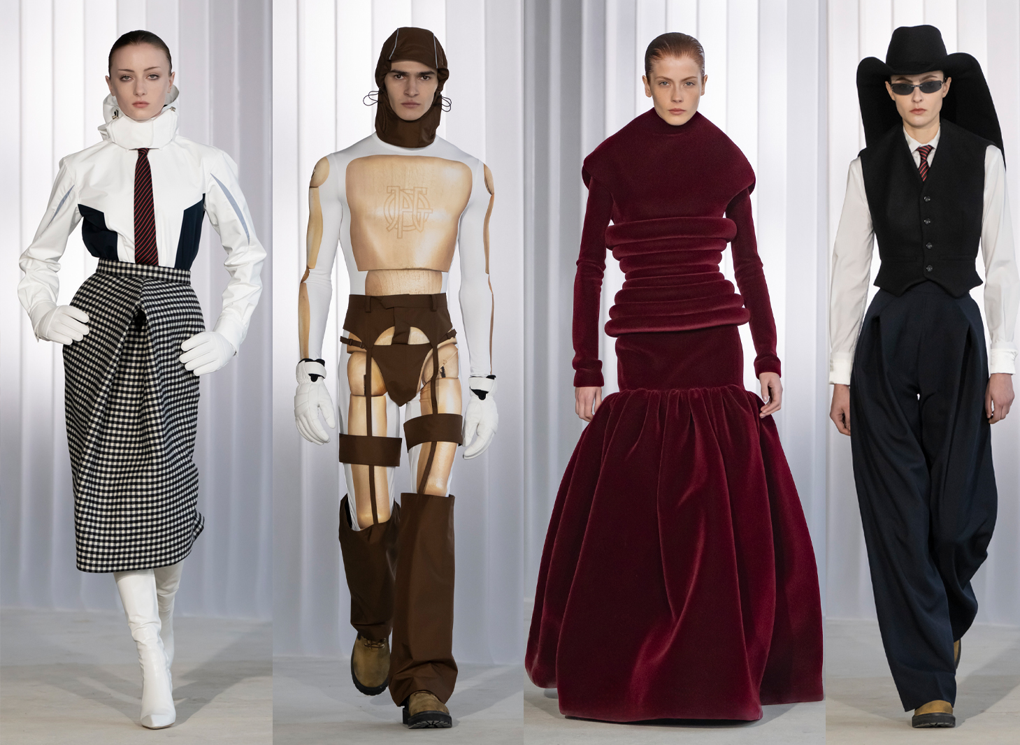 If Duran Lantink divided the critics after his Jean Paul Gaultier debut last season, he silenced them with AW26. While there weren't pistols at dawn there were cowboys in hats that curved seamlessly into waistcoats, and a smoking-gun dress. Backstage, Lantink said the collection was about his personal relationship with Mr Gaultier – “I started digging into his tailoring and researching it” – and the results were an impressive take on JPG’s gender-fluid codes. Another inspiration was a cherished T-shirt of Lantink's featuring an image of Marlene Dietrich, reprised as a jersey body-con dress modelled by Alex Consani. Dietrich’s influence appeared throughout in the strict tailoring.