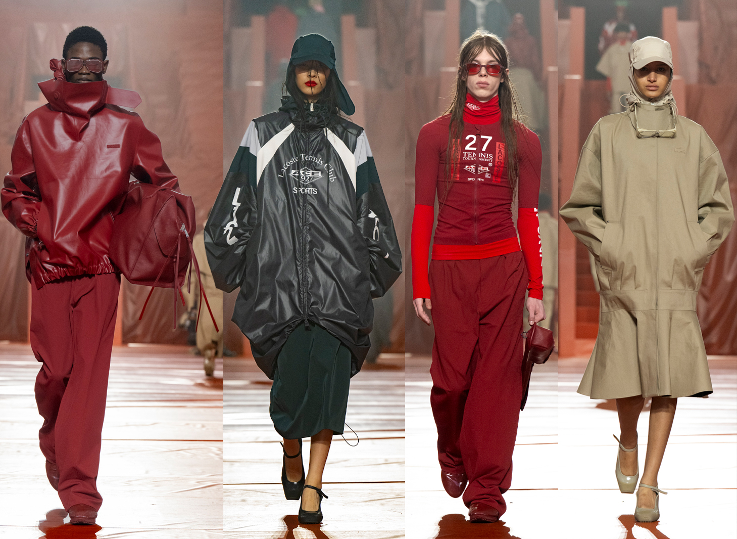 Inspired by Rene Lacoste’s washed-out Davis Cup match in Deauville in 1923, creative director Pelagia Kolotouros showed her AW26 collection for Lacoste on a tarpaulin-covered Philippe Chatrier court at Roland Garros stadium. Rain and functionally were at the forefront of the design process, backstage Kolotouros said “function informs elegance”. A 9-piece collaboration with Mackintosh was a natural progression to the rain-stopped-play story. Renowned for its rubberised fabric, the Scottish outerwear specialist worked on pieces including trench coats, a poncho polo and a pleated trench skirt all impeccably practical and ultra chic. Elsewhere cable-knit sweaters in red and pink were styled with high-performance second-skin base-layer tops. Padded and voluminous pieces in transparent nylon, or with wet or reflective finishes, layered under the soft tailoring of the emblematic René blazer. A retro tennis-club logo gave weatherproof cagoules a cool spin for rain or shine, and Grand Slam merch sweatshirts and T-shirts had both tennis and fashion fan appeal.