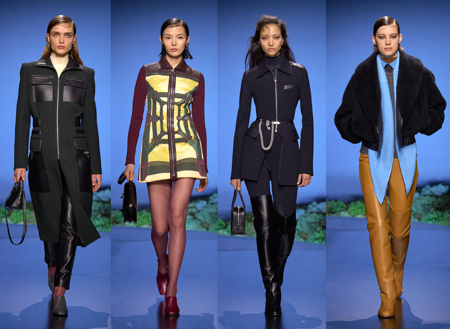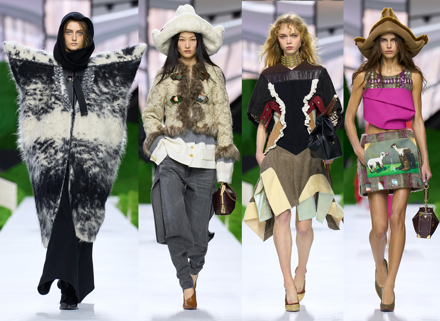 The set at Louis Vuitton was an angular green “neo-landscape” created by Emmy award-winning production designer Jeremy Hindle, known for his work on Apple TV’s Severance. In his show notes creative director Nicolas Ghesquière stated, “Clothes evolve in response to our climate and surroundings – for endurance and protection.” The French designer described the collection as “a new folklore, for the future.” Opening silhouettes of hemp-based faux-fur capes with exaggerated shoulders and extreme volumes took inspiration from shepherds and nomadic dress. Artworks of pastoral scenes by Ukrainian artist Nazar Strelyaev-Nazarko were seen as patches on jackets and skirts.