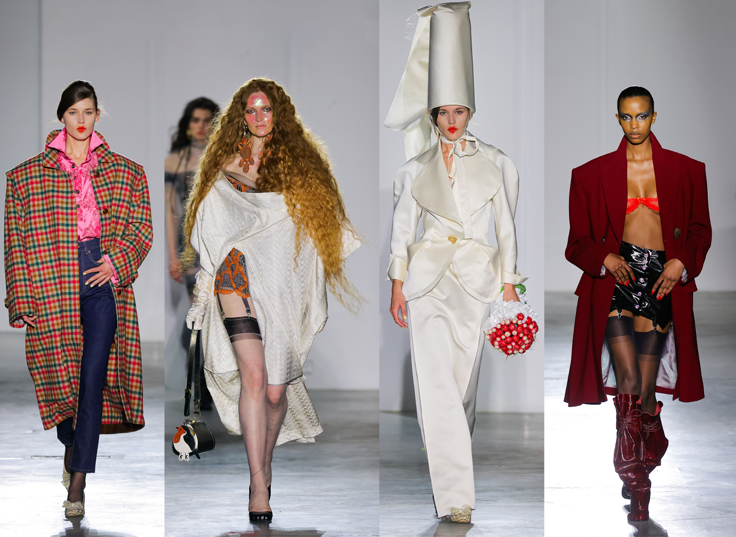 Kronthaler listed his three inspirations for the AW26 Vivienne Westwood collection as Austrian actor Romy Schnieder, Danilo Donati’s costumes for Pasolini’s The Canterbury Tales, and erotic underwear. Unpacking those influences on the runway we got a classic Westwood romp, opening with a series of excellent check coats with double-padded shoulders, college blazers and dinner jackets worn over stockings and suspenders. Experimental dresses with open seams that draped around the body felt very Chaucer, as did the smudged lipstick and smock dresses with ribbons. The medieval influences culminated in a raw-edge wedding suit with full-length skirt, fit for serial bride the Wife of Bath, complete with hennin hat and a bouquet of radishes. Front row guest Chappell Roan wore a headline-grabbing, rear-baring dress from the SS26 collection that wouldn’t have been out of place in The Miller’s Tale. Kronthaler always includes images of a robin in the collection to represent Westwood, and here they appeared as a pair of jewelled earrings and a coin purse on a bag. He penned a touching message to Westwood at the end of his brief show notes: “I miss you every day. I’m trying to get used to the world without you. It’s not easy but I will keep working.”