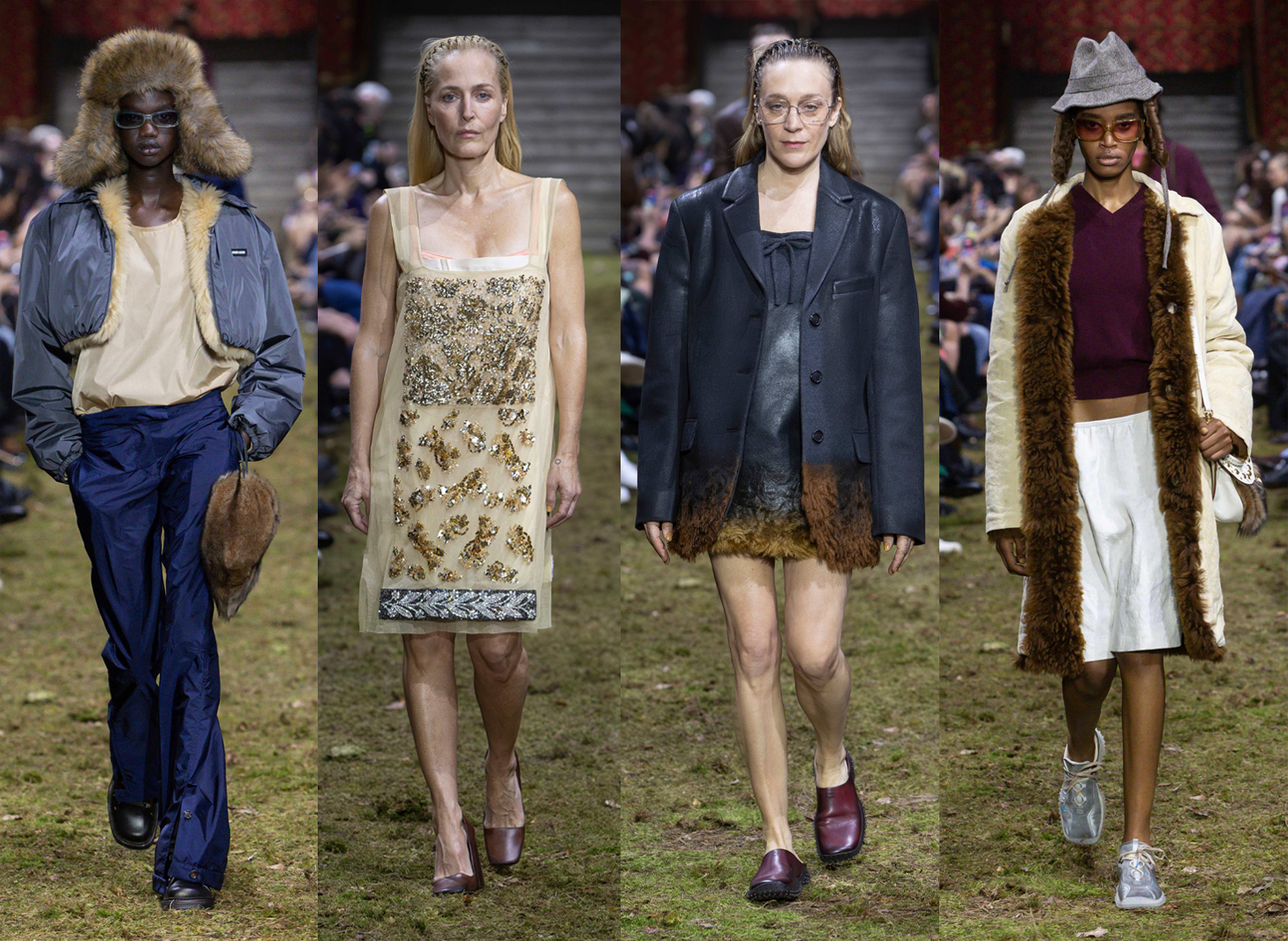 Chloe Sevigny first walked for Miu Miu 30 years ago and a buzz of excitement spread throughout the audience as she strutted past on the AW26 runway. Many new fans of the brand won’t have been around in 1996 but Sevigny’s style legacy has kept her on moodboards constantly – she’s That Girl and Miu Miu is a brand for everyone who aspires to be That Girl, no matter their age. Titled “Mindful Intimacy”, the collection focused on the smallness of our human bodies in the vastness of the world. There was a distinct shrunkenness to the silhouettes. “A focus on our bodies, our minds, ourselves,” Mrs Prada explained. Intentionally crumpled and washed finishes with underwear bows poking out added a realness. Seventies narrow suits with bracelet-length sleeves and trailing trouser hems dragged across the moss-covered catwalk. Mini dresses were worn under shearling-lined jackets. Cropped nylon anoraks worn with low-slung trousers, the midriff gap bridged with a tucked-in camisole. Looks were finished with deer-stalker furry hats and crystal embellished trainers. Another star turn came from Gillian Anderson who closed the show – and the Fashion Week season – wearing an embellished nude flapper-style slip dress.