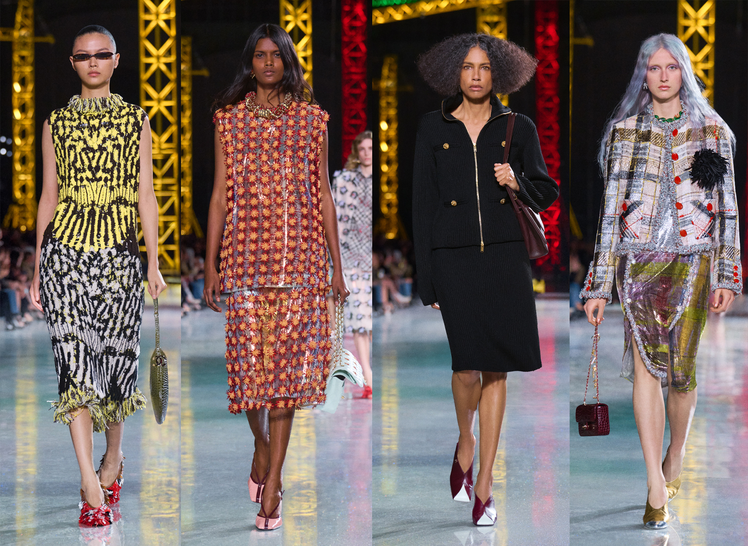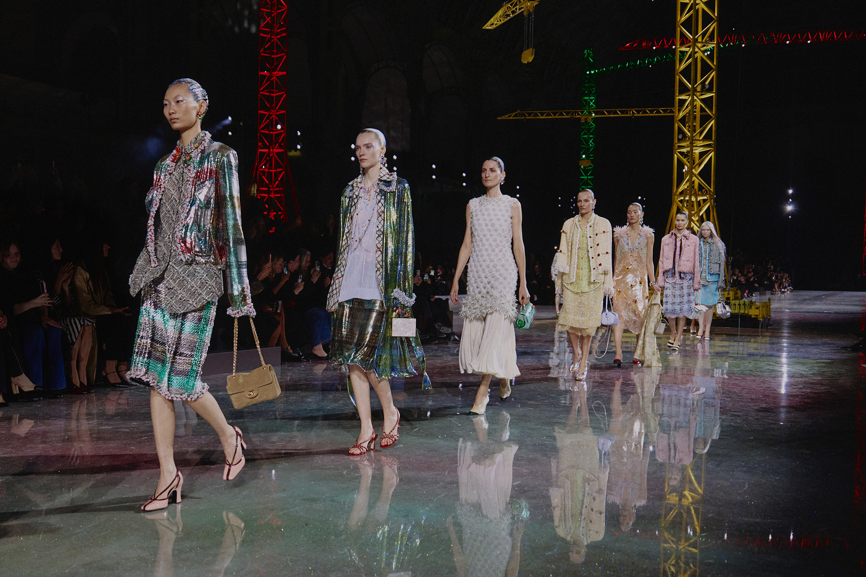 Matthieu Blazy’s second ready-to-wear collection for Chanel picked up his imaginary conversation with founder Gabrielle Chanel as he continued to carefully build the new era of the house. To symbolise the work in progress the set consists of giant Lego-hued cranes stretching up to the glass-dome ceiling of the Grand Palais. As Chanel famously said: “Fashion is both caterpillar and butterfly… we need dresses that crawl and dresses that fly.” Blazy delivered a 78-piece collection that fulfilled the brief. Opening and closing with simple black looks he took us from a comfortable ribbed-knit version of the classic Chanel skirt-suit to an elegant LBD with a surprise camilia suspended in the open cowl back.