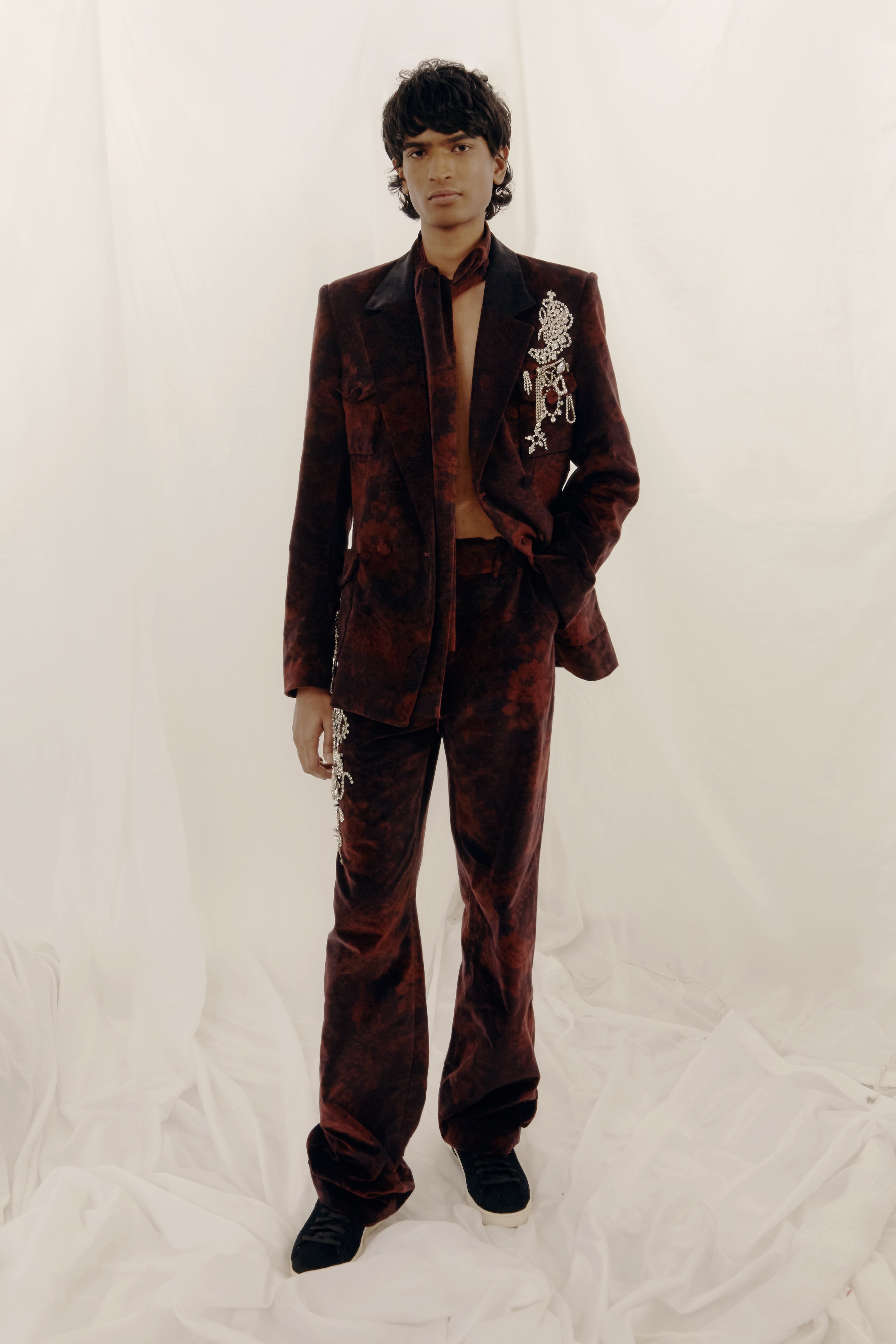 Founder and creative director Daniel Gayle and artistic director James Bosley chose an intimate presentation accompanied by a live piano performance to show their AW26 collection. The south London based duo showed a concise edit of 10 looks drawing on the brand's signature styles including Pearly King and Queen button embellishments, seen on a shirt bib and elevated sportswear – a red nylon bomber jacket had a curved tail coat hem with a majestic black feather trim. Mixing domestic charm and ceremonial regalia has become part of the brand’s handwriting. The print on a velvet suit came from a photo of Gayle’s grandmother's carpet and the crystal embellishments are a nod to childhood raids of his mum's jewellery box. A lace print shirt was made by spray-painting through net curtains. It’s five years since the brand launched and it continues to go from strength to strength, counting a piece in the Costume Institute’s permanent collection following the Met Gala Superfine exhibition among its achievements. Proof that small can be mighty.