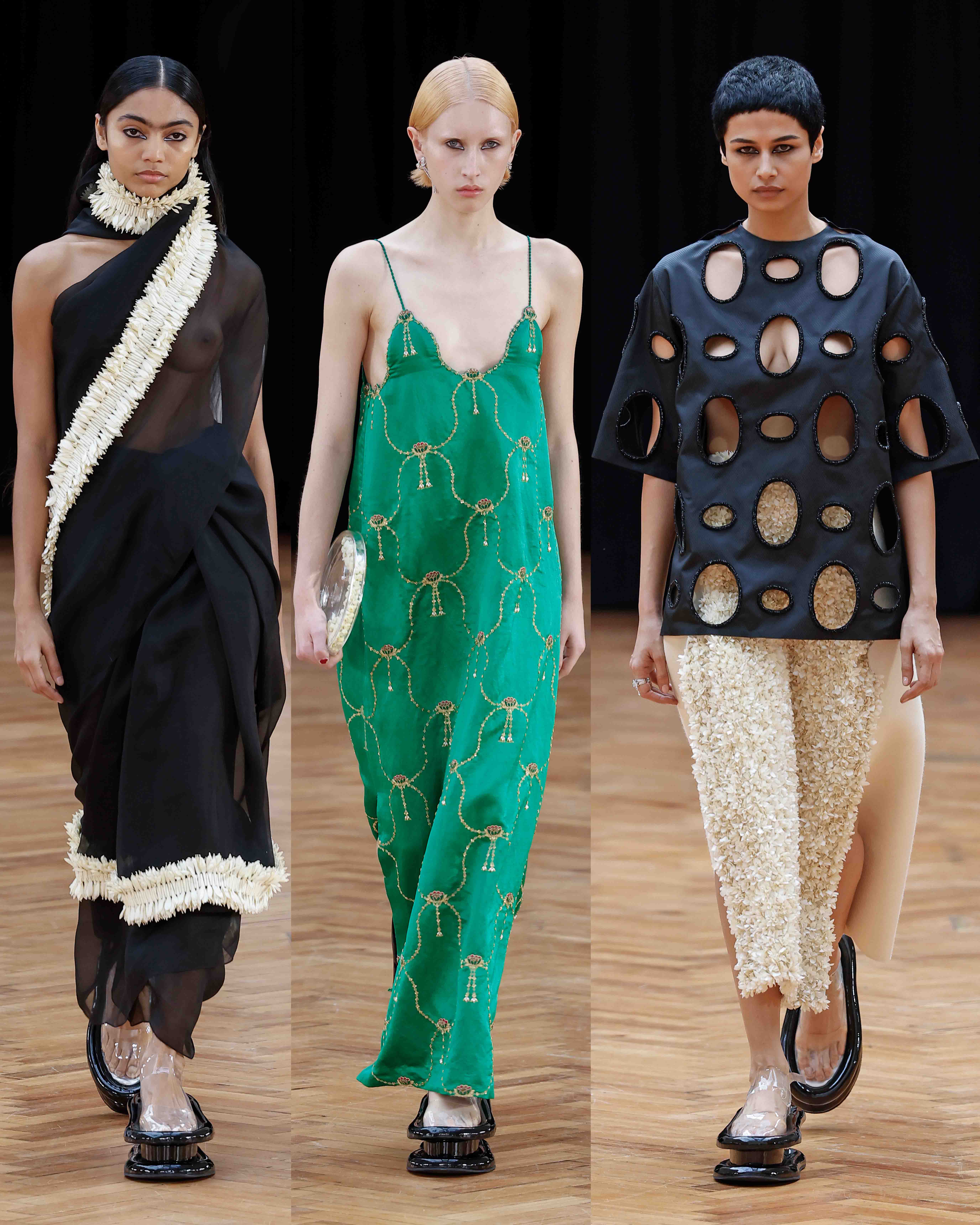 Indian label Raw Mango made its London debut on the final day of fashion week. The collection, called It’s Not About the Flower, was presented at Westminster’s Lindley Hall and explores the significance of the floral garland in Indian culture. Founder Sanjay Garg, a textile designer who started the brand in 2008, working with handloom weavers to produce a line of six saris. This AW26 collection explores how the garland emerges through gathering, becoming a social object which is shaped by landscape, community, season and belief. The clothing created by the brand is shaped through the work of over 1,200 weavers across India – from Rajasthan, Madhya Pradesh, Andhra Pradesh, West Bengal and Varanasi. For AW26 floral structures are reconstructed through handwoven textiles which cascade down from a bralette, carve out the swooped necklace of a cropped vest top or spiral from lapels wrapped around the neck. The collection felt modern and celebratory of the female body with dresses and tops having circle shaped cut-outs or sheer material that revealed the skin of the wearer. Bursts of emerald green and neon yellow were present in a string of vibrant dresses in both traditional and modern more figure hugging shapes, many of which were embroidered with intricate floral motifs. Raw Mango was a welcome addition to London fashion week, a collection that was impeccably constructed and full of energy, we hope it here’s to stay.