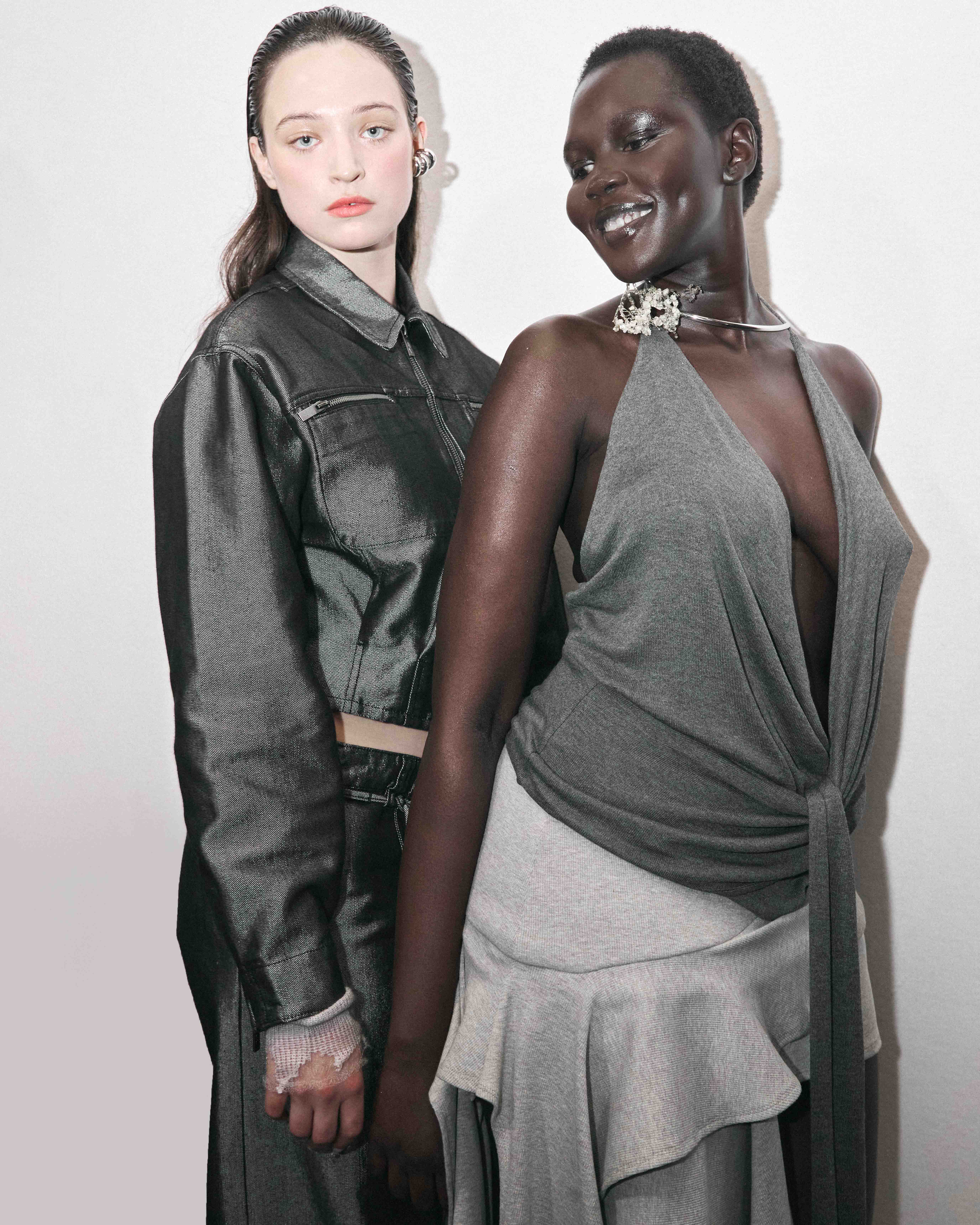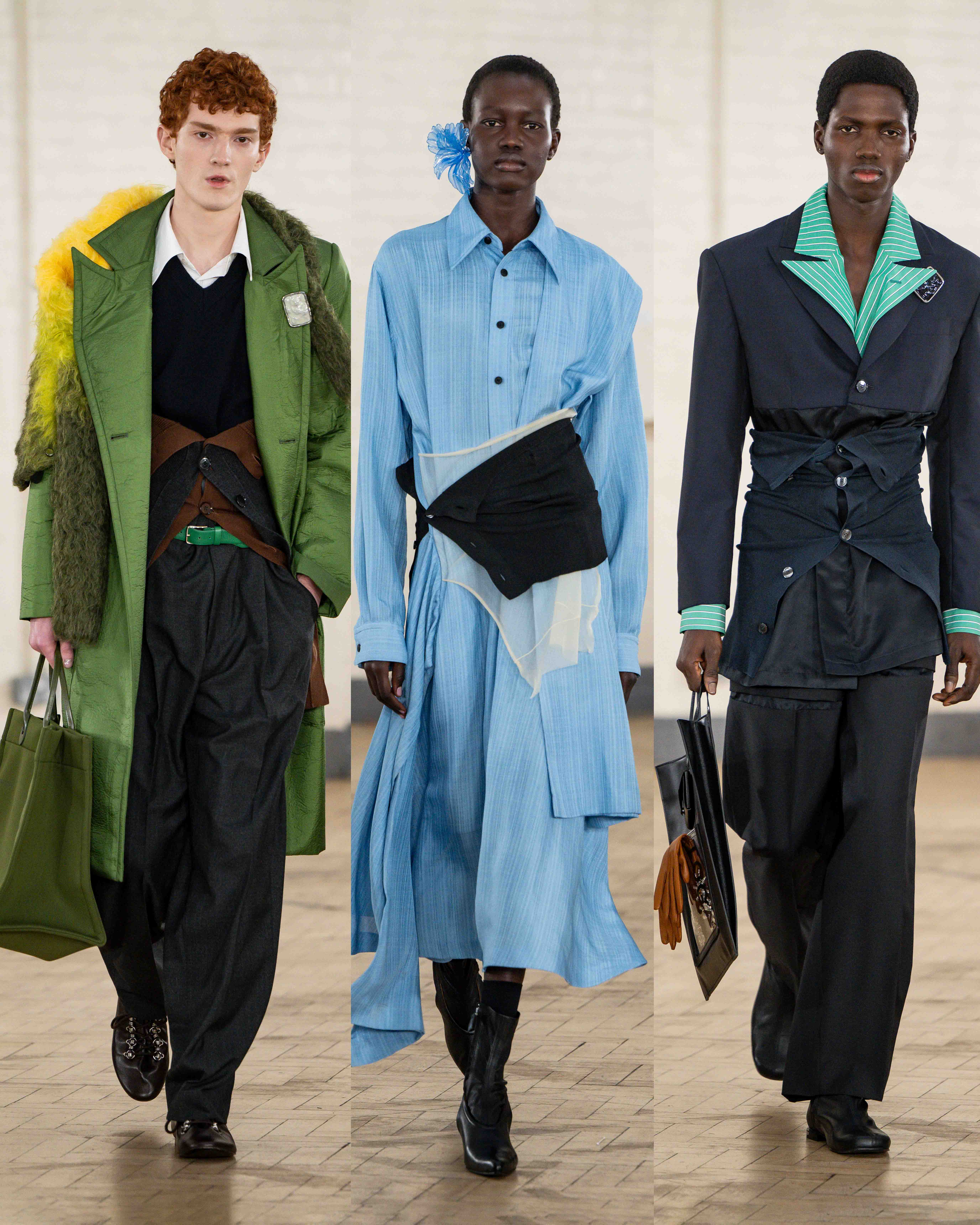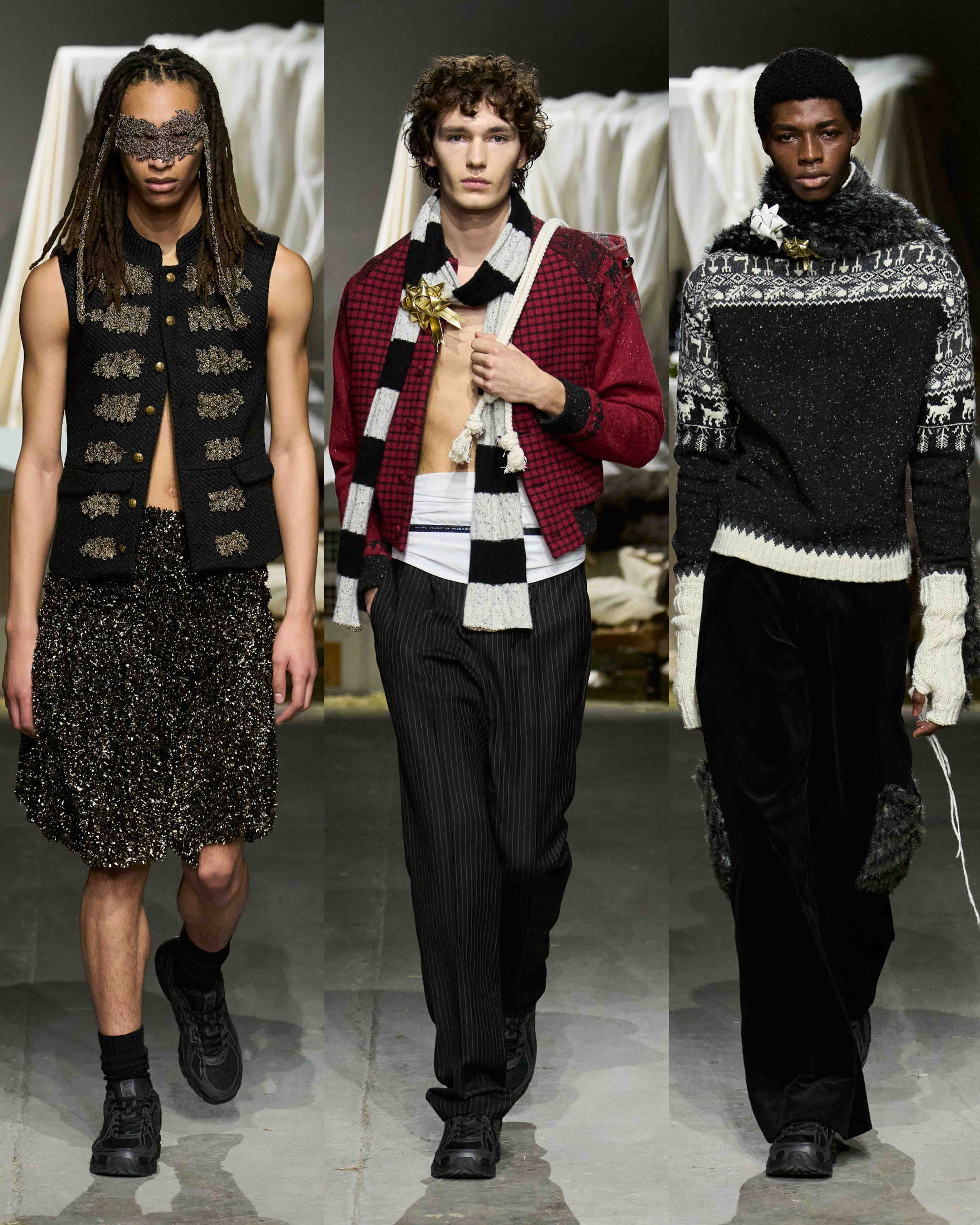 Chinese-born Oscar Ouyang’s The Last Party collection explored the imagined life of an aristocratic family who have become unexpectedly bankrupt. The teenage children, oblivious to the reality of the crippling debt, decide to commemorate their last night of luxury by pulling on the luxurious wardrobe of their elders and throwing a debaucherous party. Ouyang transformed the New Gen show space into a chic but chaotic medieval after-party. Dark wood cabinets and ornate gold mirrors peeped out from underneath large dust sheets whilst the floor was littered with upturned bottles of beer and wine. Silhouettes unpacked traditional British tailoring by way of military safari-style jackets that were luxuriated in a French wool tweed. Similarly to previous collections, the majority of the clothing comes in the form of knitwear, which Ouyang sources from mills in Italy, China, Mongolia and Ireland. Fair Isle knits have an almost iridescent look with panels that seemed to twinkle underneath the catwalk lights. Dress shirts, draped cumberbands and animal masquerade masks felt reminiscent of Emerald Fennell’s Salt Burn and a handful of miniature leather rosettes were pinned to lapels and scarves. We think it's safe to say: there ain’t no party like an Oscar Ouyang party.