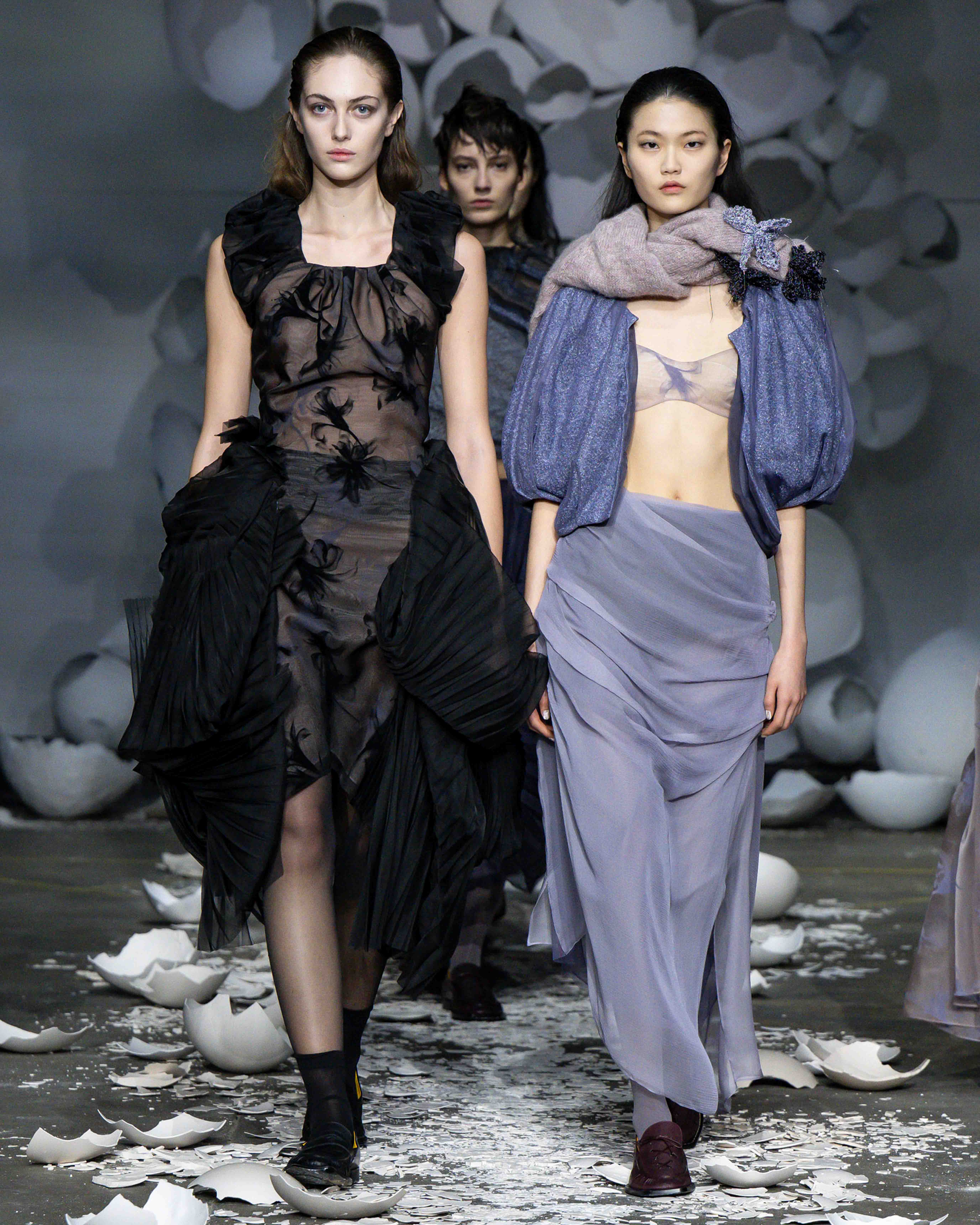 Walking on Eggshells, Dujancourt’s AW26 show, featured a runway of smashed eggshells and sculptures inspired by Maria Bartuszová’s abstract white plaster sculptures. Dujancourt drew from themes of womanhood and witchcraft persecutions, influenced by Mona Chollet’s book, In Defence of Witches: The Legacy of the Witch Hunts and Why Women Are Still on Trial. Dujancourt’s designs reflected that many “witches” throughout history were killed essentially for being part of an all-female community. After seeing images of witches at home in their beds in the dark, making lace with wooden bobbins, the designer realised the comparison to her team and decided to mirror those techniques. Her team works in unison each season, weaving the intricate fabrics that become the collection. Crochet, handknitting and tulle macramé were employed on dresses, shirts and skirts, constructed from over 80 strips of fabric wrapped around and woven together, giving garments a structural framework. There were plenty of all-black looks, a skirt cut from swirls of pleated silk, and a dress with a lace front and knitted bell sleeves. Later came intricately handknitted alpaca outerwear pieces, which featured woven hoods and pockets reminiscent of tulle, followed by chiffon silk looks that create a mystical illusion through pleating and movement. Dujancourt’s skill lies in her ability to make the heaviest of knits appear featherlight and other worldly.
