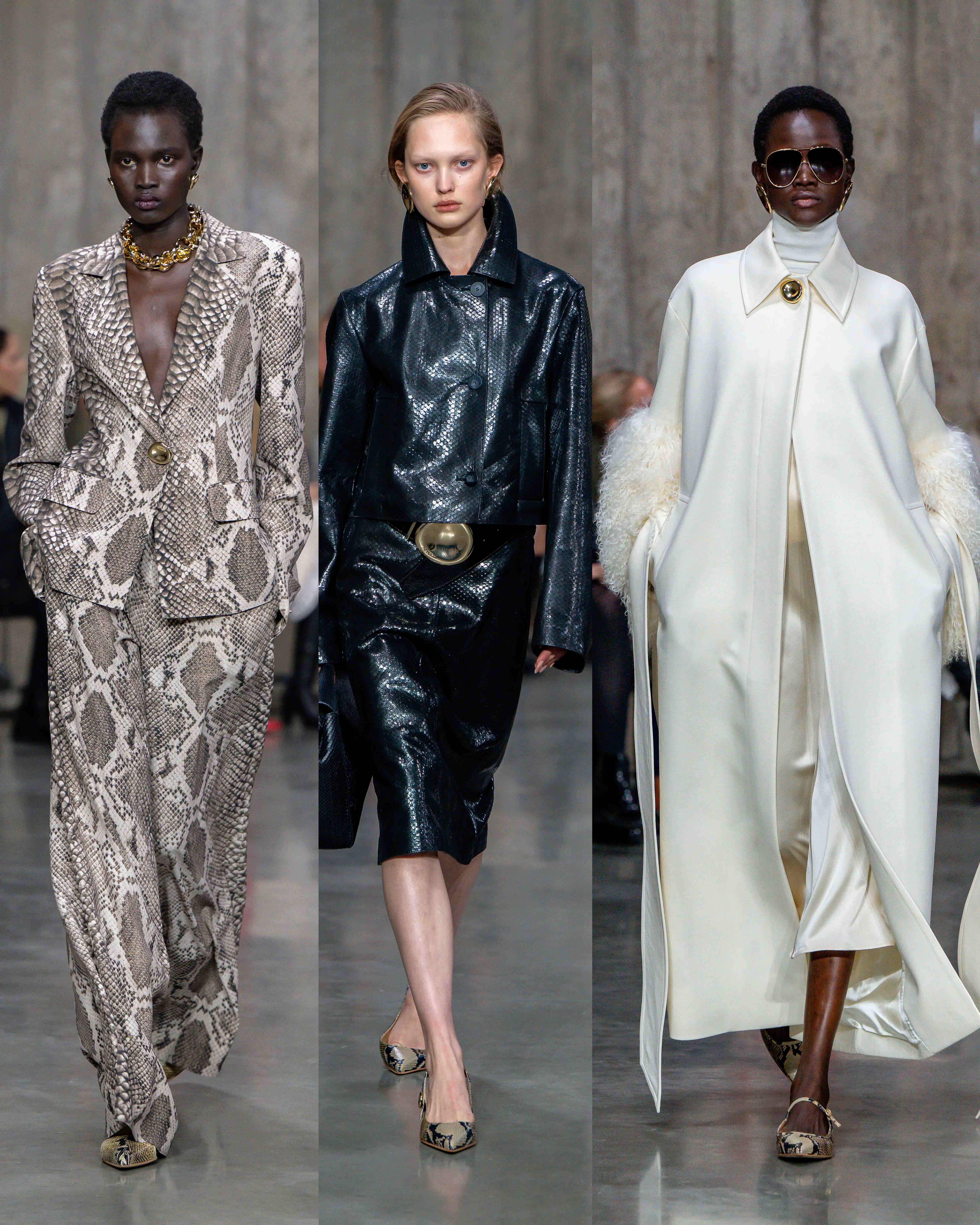 This was Mario Arena’s runway debut for Joseph. Titled Sculpture Garden and inspired by the skill of sculpture, the collection explored creating a new form, referencing how a block of marble can be reborn as a sculpture. Arena translated this idea into her dramatic shapes, which the designer created with fabric, shearling and wool. Joseph is known for it's quiet luxury, added to this was the attention to craft and detail. The collection was brimming with floor length capes and coats that fell with easy around the body, one in fluid herringbone another in cream wool with fluffy cuffs. Long capes and cape coats in olive and burgundy were peppered throughout. The play on proportion came with oversize knits, noteworthy was a white, double roll-neck sweater, and gigantic leather handbags that added slouchy desirable touches, the perfect weekend away carry-all. Eye-catching details finished the looks, feathery fringing was scattered across the front of knits and suits, while statement jewellery - gold belt buckles and chunky bracelets was an introduction to the new accessories line.