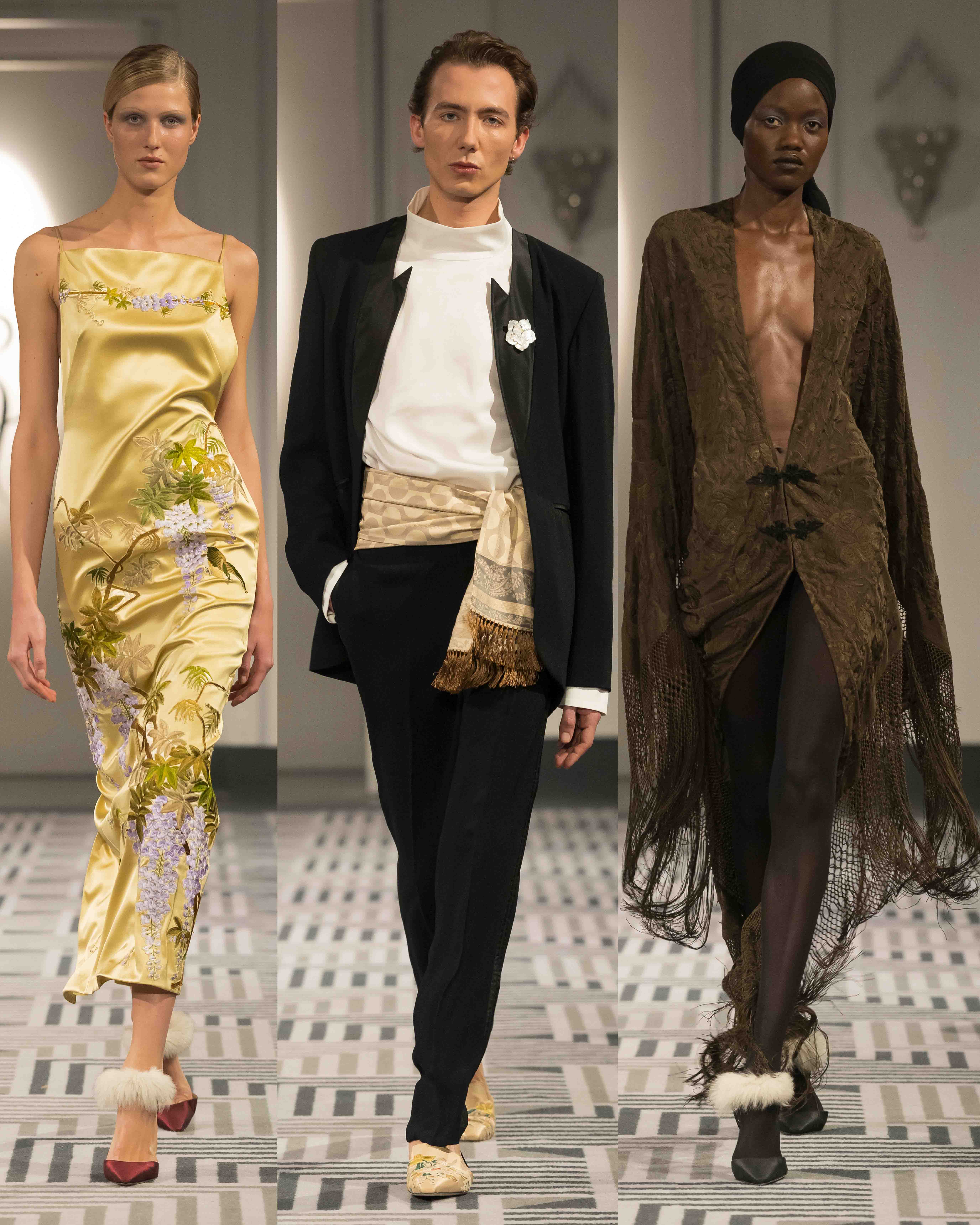 Held in the gilded ballroom at Claridge’s, Conner Ive’s AW26 show featured a cast of familiar faces, including 90s supermodel Debra Shaw and muse Tish Weinstock, as well as the gloriously fabulous, Kim Cattrallon the front row. Entitled Eldorado, the collection’s main inspiration was a club in Berlin of the same name, a safe and inclusive space of euphoric hedonism before the Nazis took over in Germany. Gender expression and LGBTQIA+ equality has been something the designer has fiercely supported during his career, most notably with the release of the “Protect the Dolls” T-shirt, which raises money for the Trans Lifeline charity. Ives harkens back to the art deco aesthetic of the 1930s. A muted yellow silk was used for the construction of several pieces, a tailored jacket paired with jeans, a scoop neck vest and midi-dress, which were all embroidered with a luxury Qing Dynasty tapestry. A brown dress with plunging neckline had flowing fringe falling from the sleeves and skirt and menswear ties and scarves sported bold geometric patterns. Tobagonian-American actress, author and activist Dominique Jackson closed the show in a bridal gown made from deadstock silk organza. Ives’s final word via his show notes called out ICE and “the dismantling of democracy”. “Let our presence be a protest,” he declared.