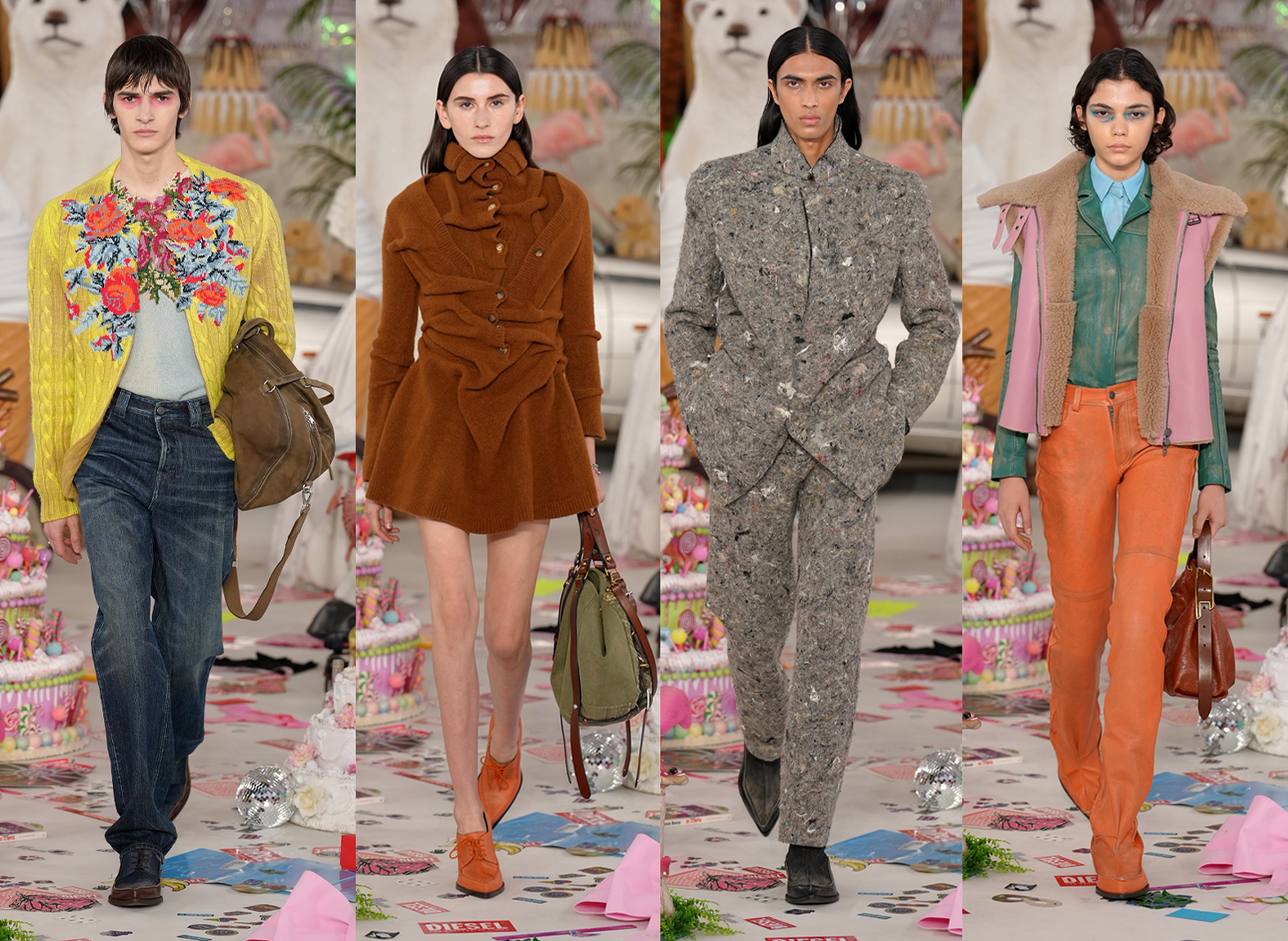 Bunnies! Basketballs! Bondage gear! Pizza Boxes! The Diesel AW26 show set saw around 50,000 pieces of archival memorabilia from throughout its 48-year history artfully arranged across the sprawling expanse of a warehouse show space. The car-boot-sale meets messy-bedroom meets curiosity-museum scene formed the heartbeat of the catwalk representing a collection that celebrated the details that define individuality. Creative Director Glenn Martens is one of fashion's true original thinkers, and for this season, he said it was a collection "about waking up in a place, with no idea what happened last night, and you are the most glorious person ever. When you sneak away from the hotel room of the person who you don’t even know, you are truly at your best." Artful dishevelment aside, he presented a truly glorious collection of twisted - often coated - denim, shrunken intarsia knits, felted tailoring, and vintage Diesel band tees, many of which were created using recycled materials as a part of the brand's sustainability programme, Successful Living. Accessories, meanwhile, made every look pop: hairclips gripped the handle of the new Noughties-tastic D-One bag, wrists dripped in charm bracelets, and hair was clamped down under wraparound eyewear. "These are super-wearable pieces for successful living, the essence of Diesel,” said Martens.