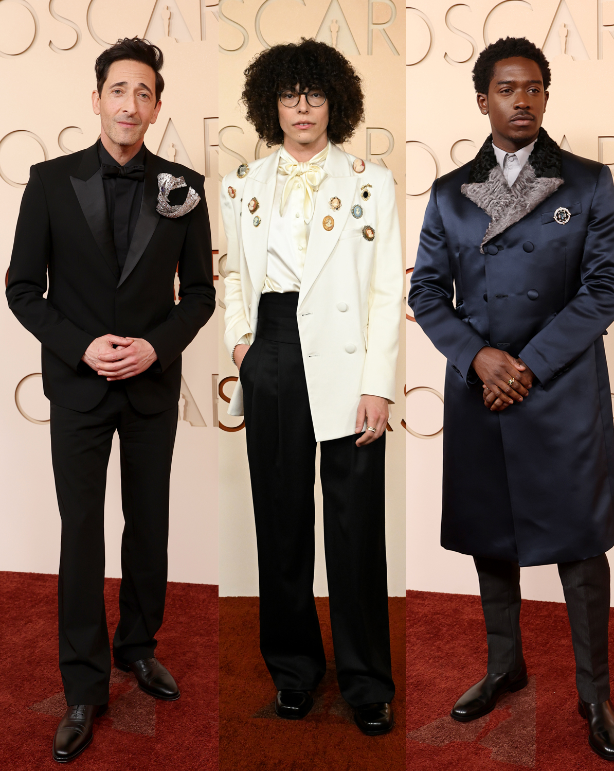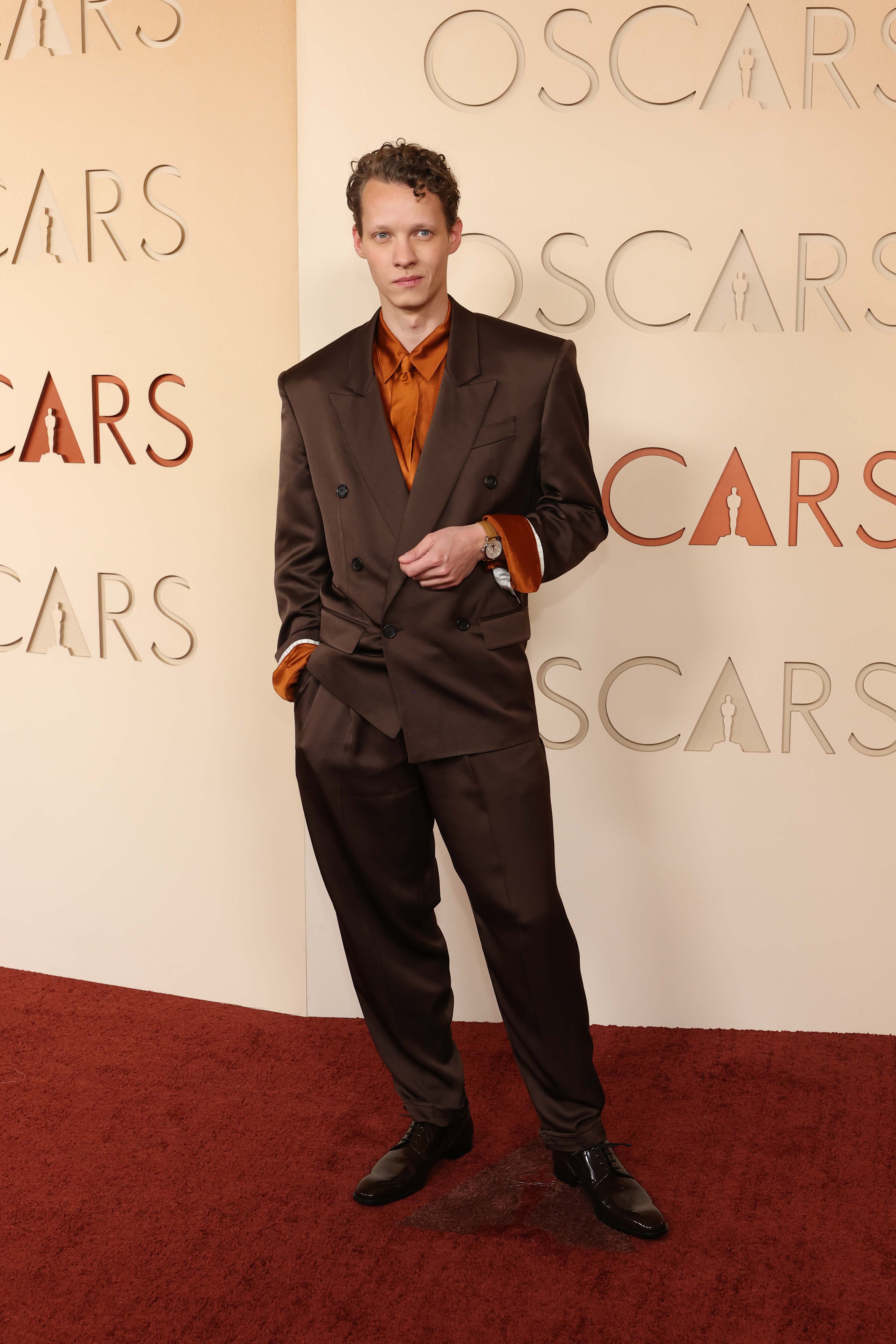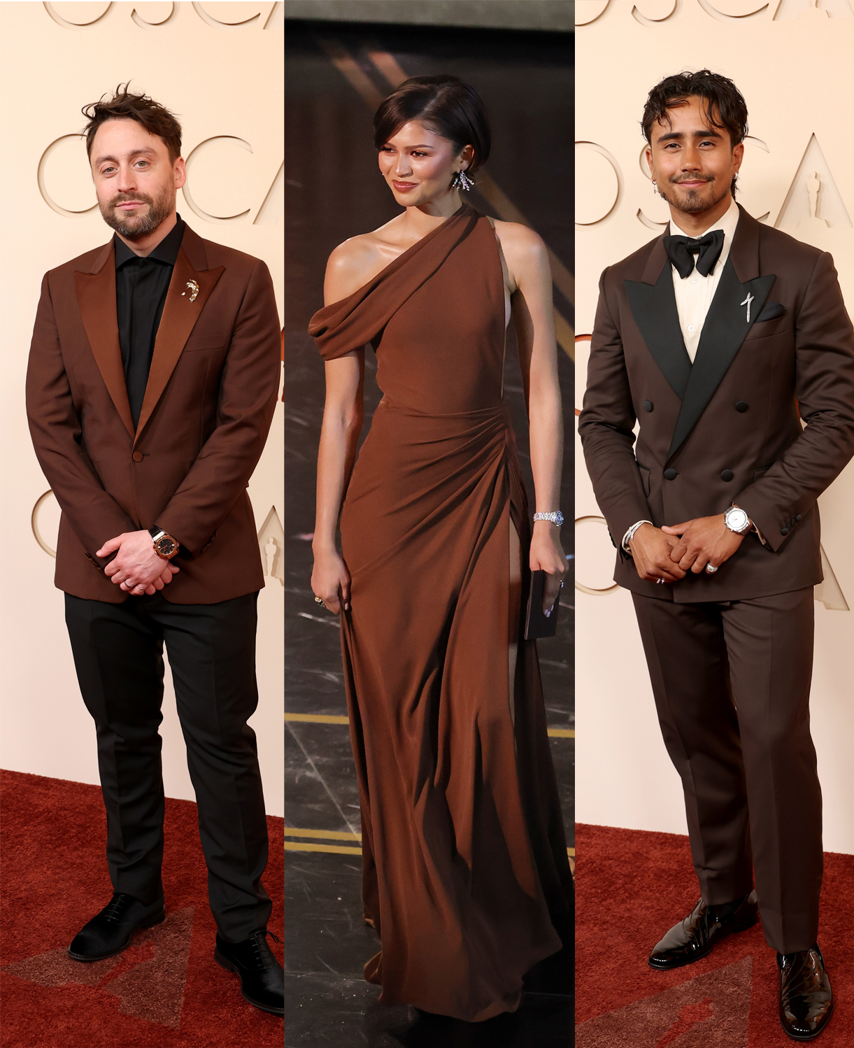 Earthy tones were a recurring theme for men not wanting to stick to the classic black tie look. Kieran Culkin’s rust-hued Paul Smith blazer, and actor and musician Michael Cimino’s dark chocolate double breasted Lardini tux, were a welcome twist on a traditional look. Sinners actor Miles Canton’s deep russet Amiri suit with matching tie was another winner. Felix Kammerer’s double-brown Saint Laurent look was one of the best of the night. Special mention to Zendaya – who skipped the red carpet, making a surprise appearance to present the Best Director award, wearing an asymmetrical chestnut Louis Vuitton gown with a side cut-out and thigh-high leg split. Her stylist, Law Roach, wore a 1997 archive McQueen coat depicting Archangel Michael from Hans Memling’s The Last Judgment.